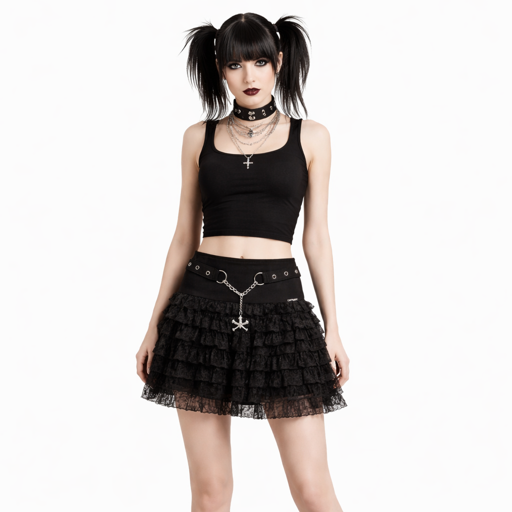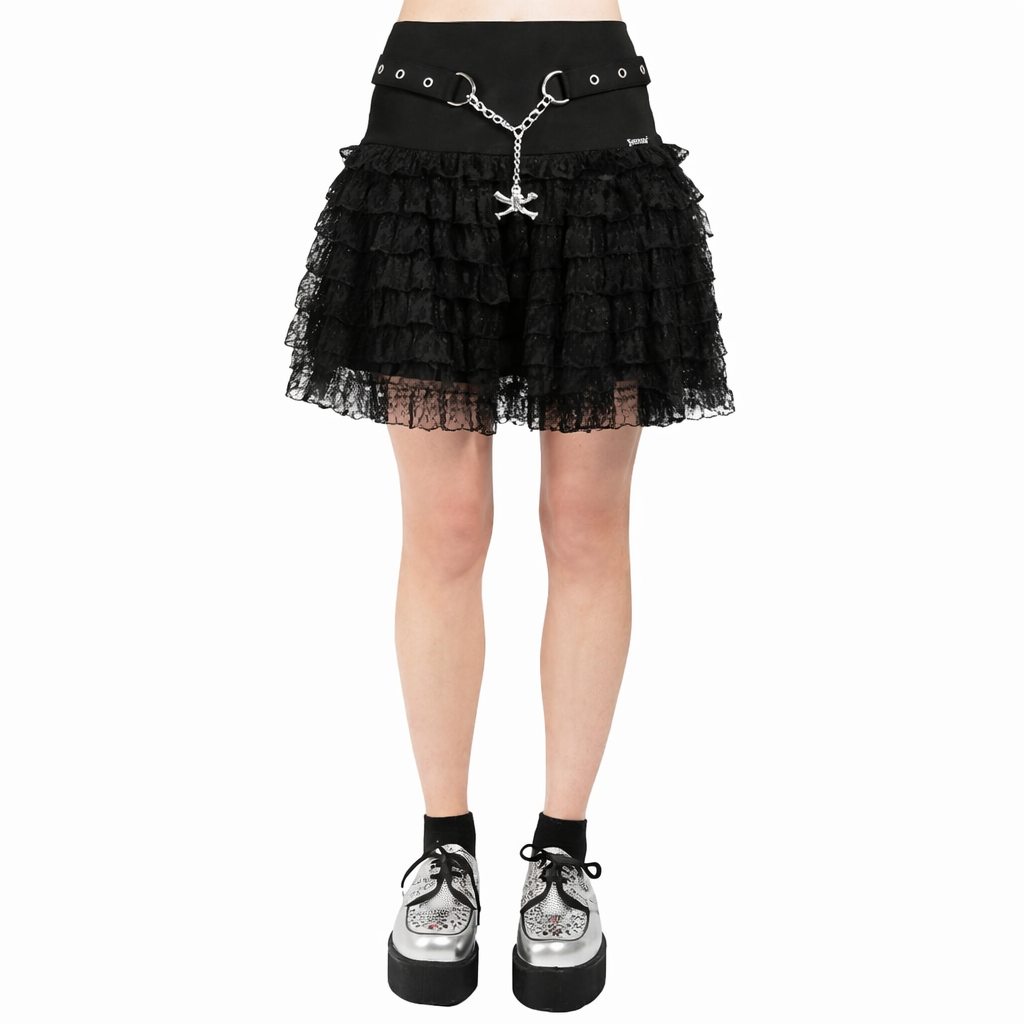 Плиссированная юбка с кружевной подкладкой, украшенная стразами, заклепками и застежкой-молнией сзади.