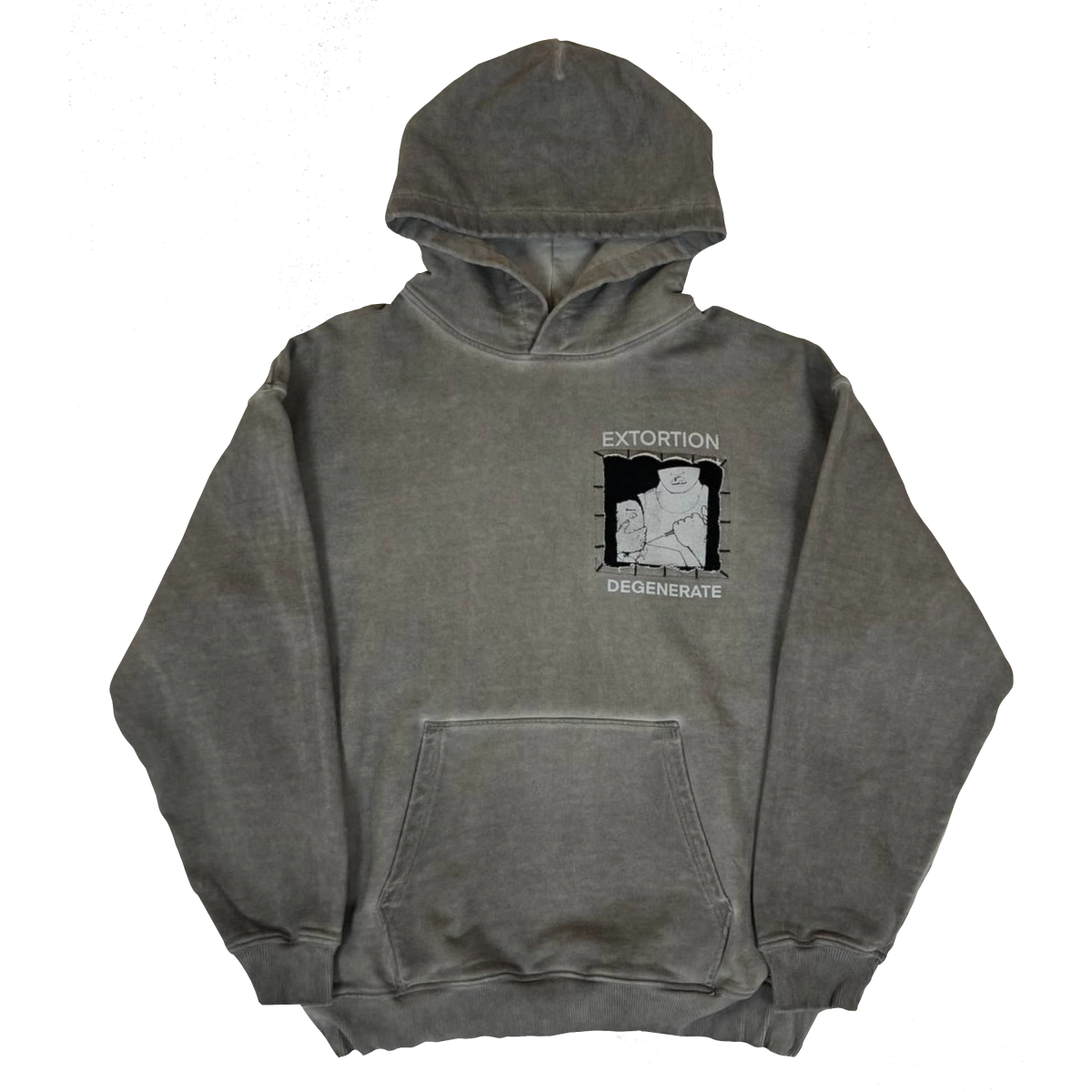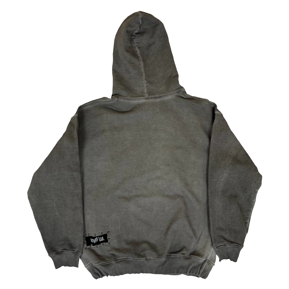 Худи из плотного хлопка, окрашенное по технологии Garment Dyed. Печать — шелкография.