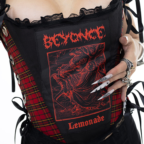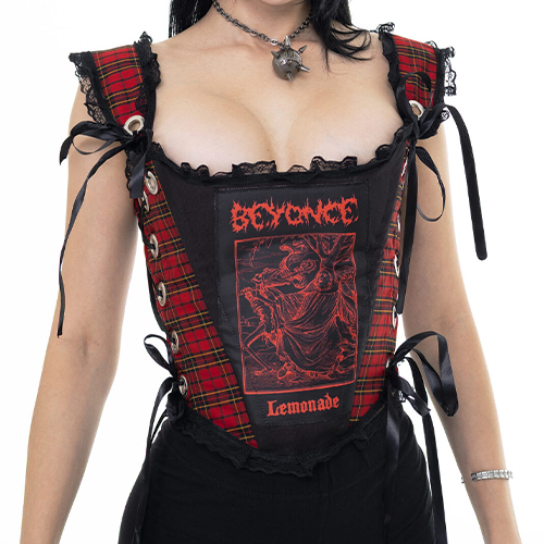 Чудесный корсет из черно-красной клетчатой ткани с черными вставками и нашивкой, по всему периметру корсет украшен черными кружевами и корсетными вставками с регуляцией по бокам и на лямках.