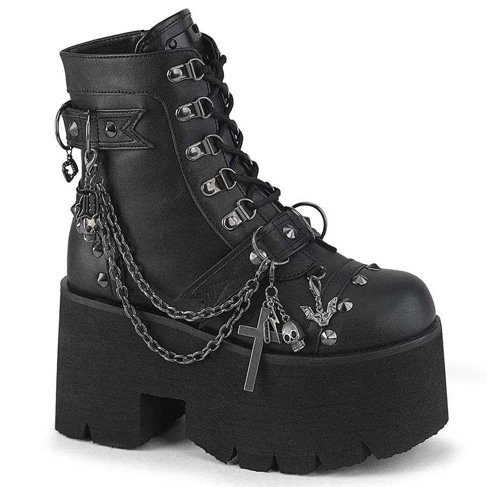 Познакомьтесь с ботинками Ashes-52: они сочетают в себе смелость и удобство в носке. Массивный каблук высотой 3,5 дюйма и платформа с вырезом 2,25 дюйма обеспечивают солидный рост, а шнурки с D-образными кольцами позволяют регулировать посадку в самый раз. Такие детали, как заклепки, фирменный язычок и свисающая цепочка-брелок, придают им дополнительный шарм. Выполненные из черной веганской кожи, они достаточно универсальны для повседневной носки, но в то же время достаточно эффектны, чтобы стать центральным элементом вашего наряда. Ходите уверенно — эти ботинки были созданы для выхода в свет.