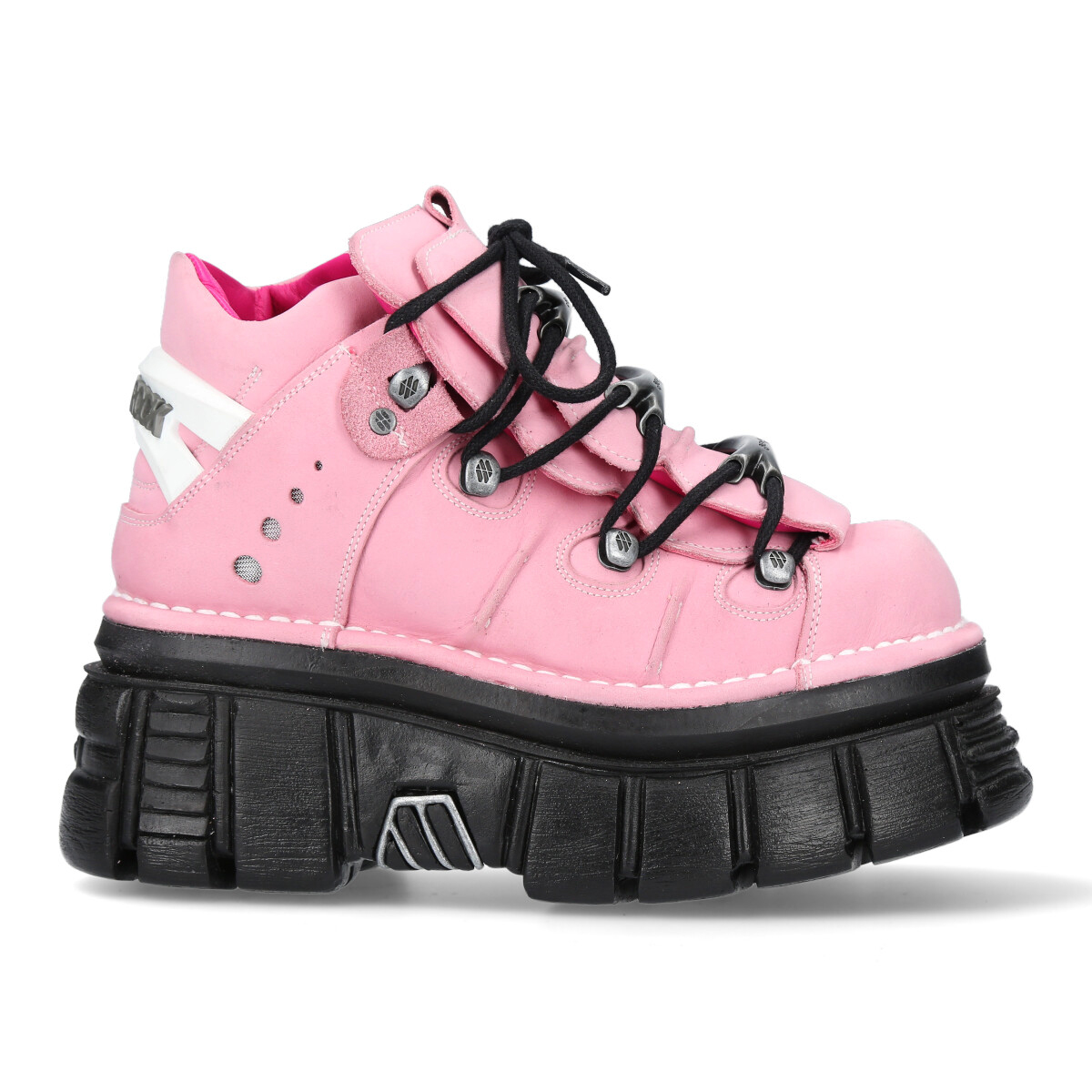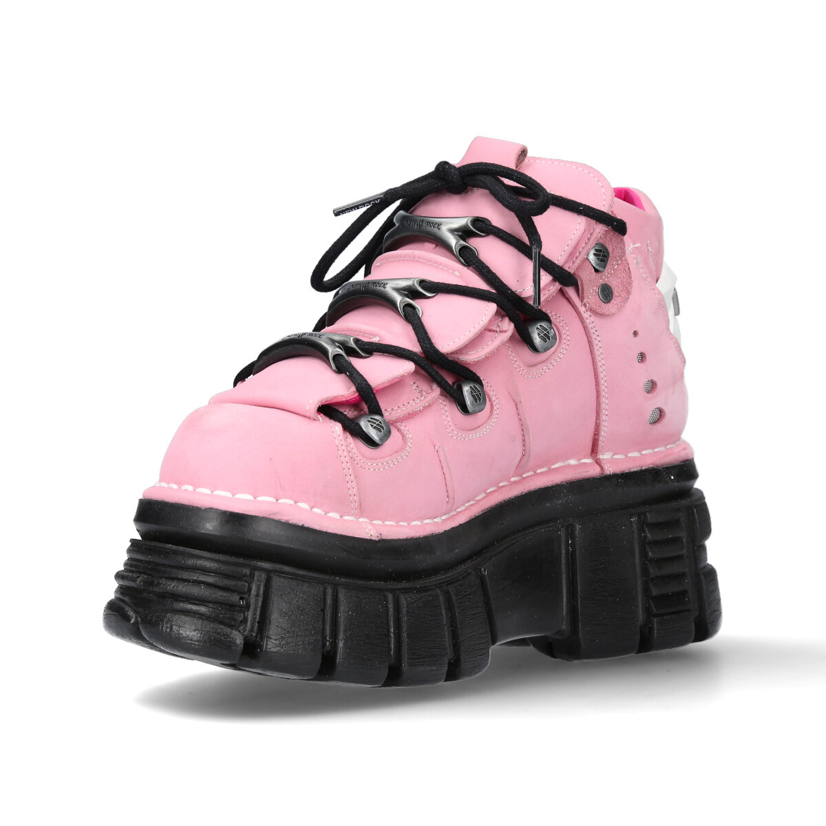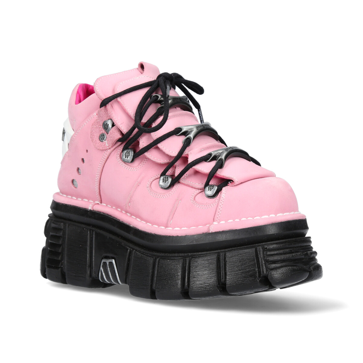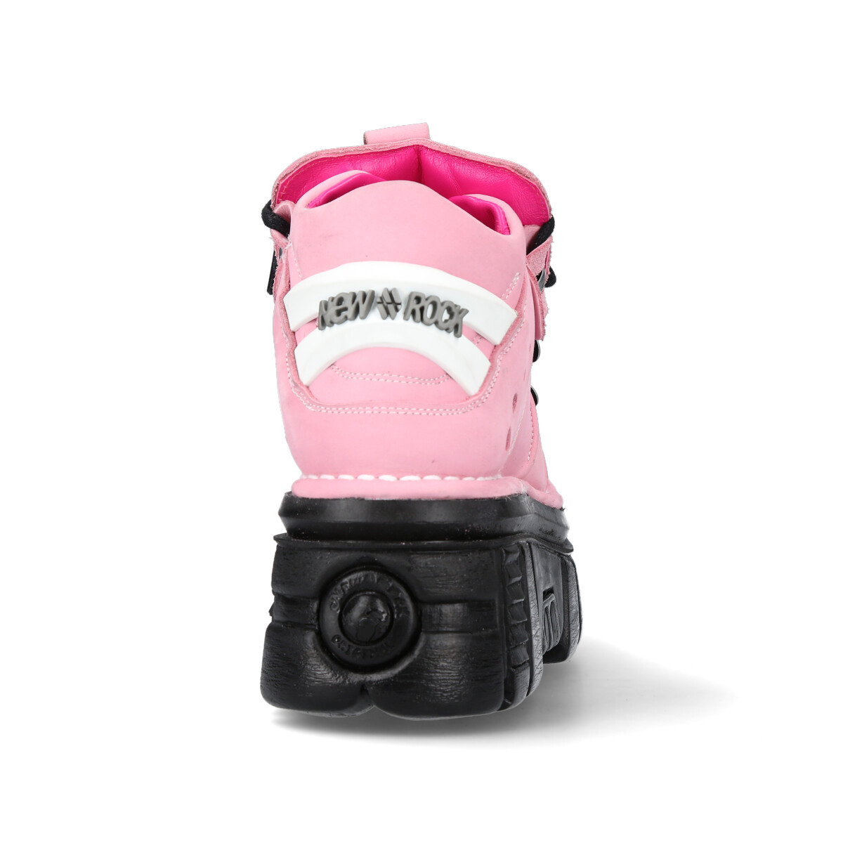 Кроссовки на шнурках с фиксаторами-крючками с логотипом New Rock. Шнуруются вокруг трех съемных металлических косточек с логотипом New Rock. На пятке пластиковый декоративный элемент в виде логотипа New Rock белого цвета. Подошва Classic чёрного цвета. Материал подошвы PU. На подошве выдавлена печать с логотипом New Rock. Стелька из натуральной кожи бежевого цвета с надписью New Rock, отделка из натуральной кожи розового цвета.