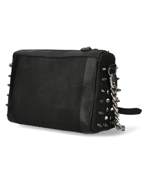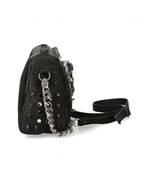 Сумка бренда New Rock чёрного цвета из натуральной кожи с декоративными металлическими шипами. В центре сумки расположен большой металлический череп чёрного цвета. Ремешок крепится на металлические цепи.