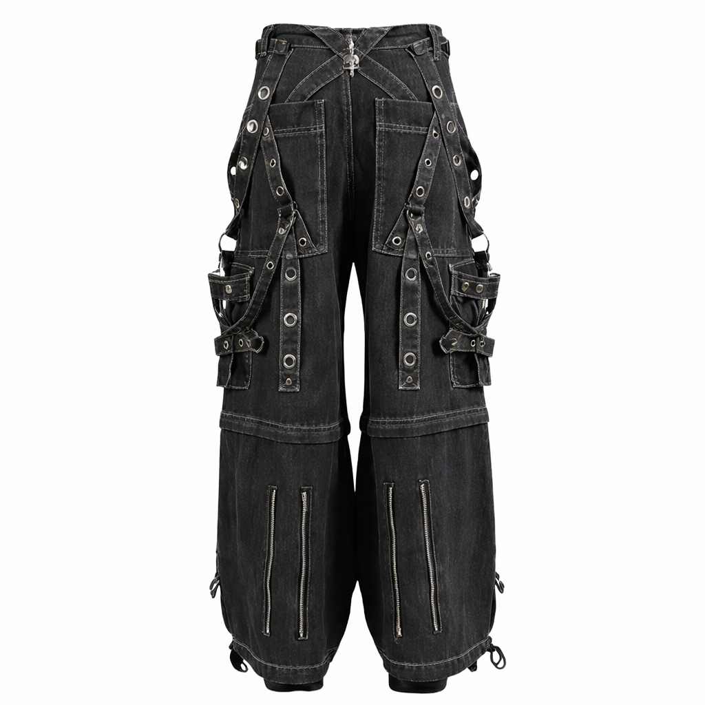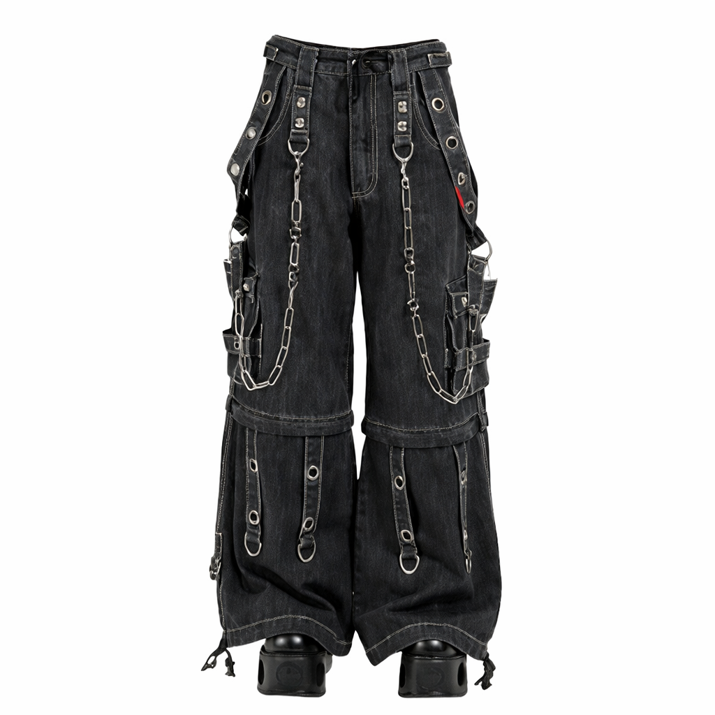 Оригинальные американские джинсы-баггиTripp Nyc линейки Darkstreet темного цвета. Они отстегиваются, превращаясь в шорты, и имеют съемные цепочки, регулируемые манжеты на щиколотках, D-образные кольца и глубокие карманы.