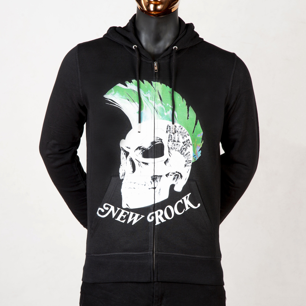 Худи-унисекс New Rock чёрного цвета из хлопка и полиэстера c белым черепом и названием бренда New Rock и зелёным ирокезом.