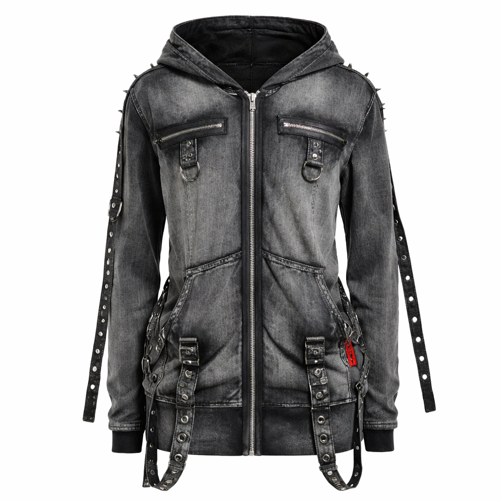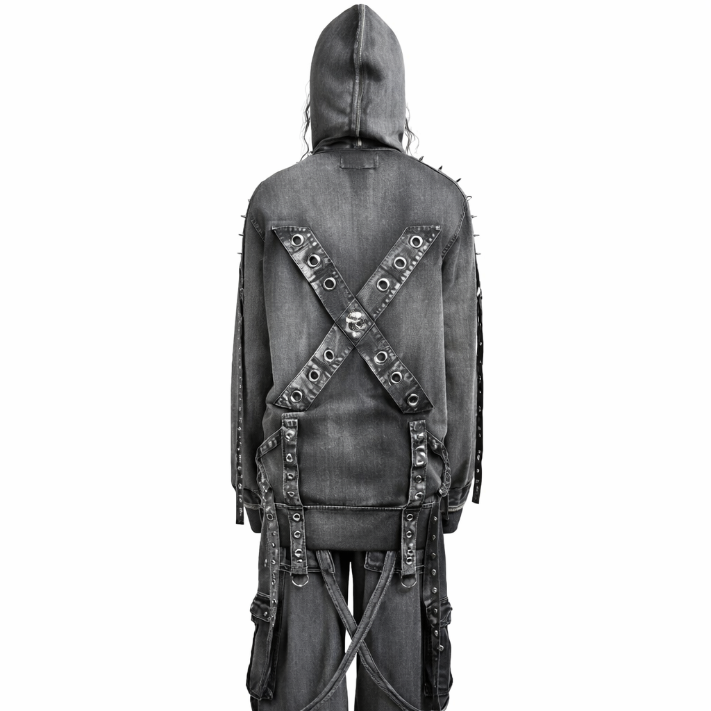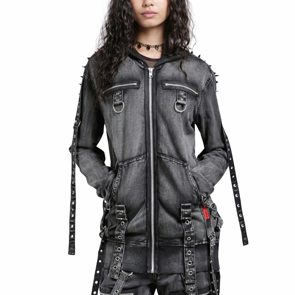 Черная толстовка американского бренда Tripp Nyc оверсайз с эффектом «механической стирки» имеет застежку-молнию с заклепками, лямками, D-образными кольцами и заклепками. Два больших передних кармана с крестом на спине и декоративным черепом.