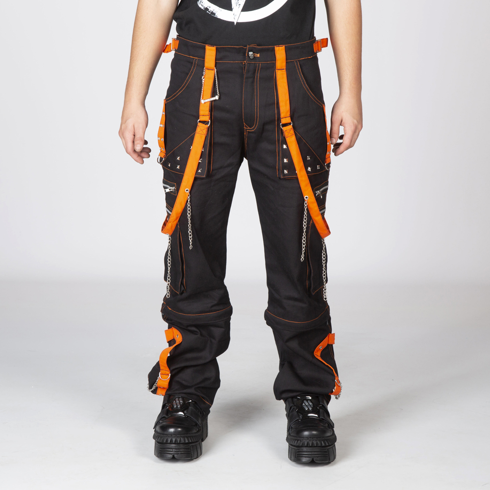 Брюки-унисекс New Rock чёрного цвета из хлопка с оранжевыми лентами и декоративными металлическими элементами.