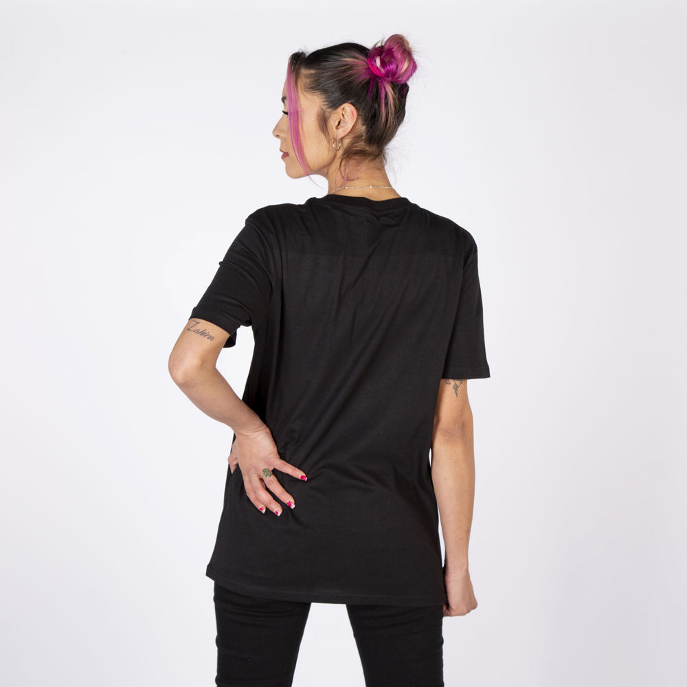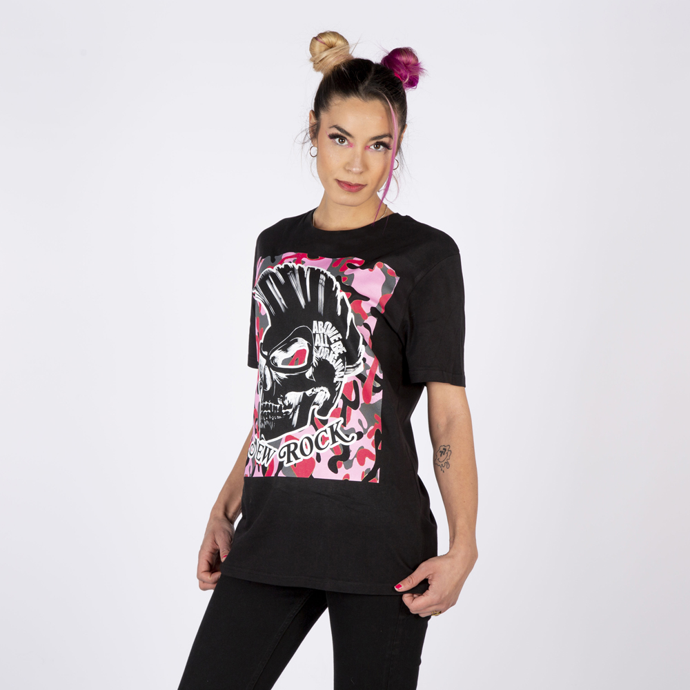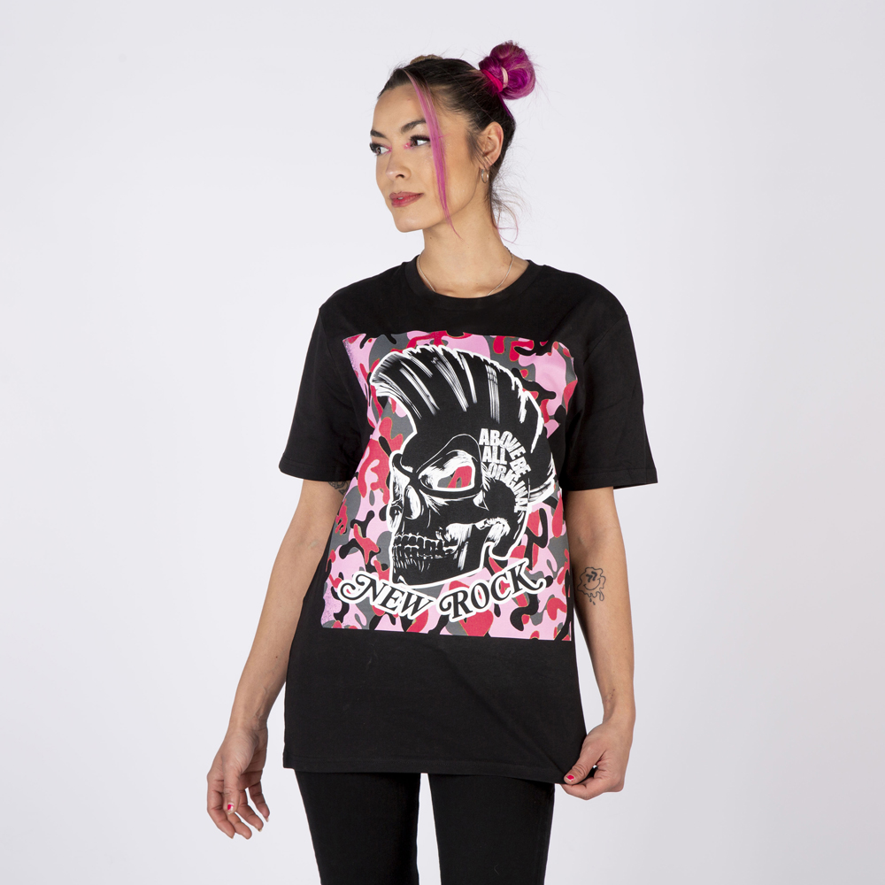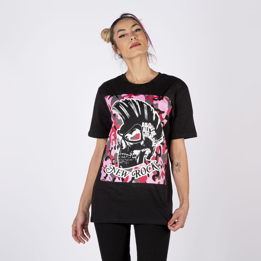 Футболка-унисекс New Rock чёрного цвета с рисунком черного черепа на бело-розовом фоне и названием бренда New Rock.
