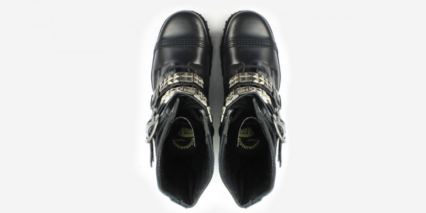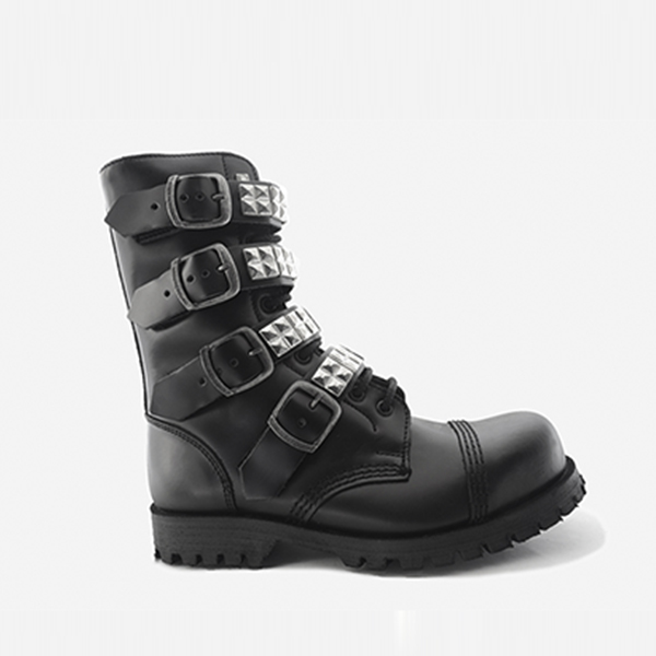 Высокие модельные ботинки бренда Underground чёрного цвета из натуральной кожи. Резиновая одинарная подошва чёрного цвета. Четыре металлических пряжки на застежках, украшенных металлическими пирамидами. Взрослые, демисезонные, унисекс.
