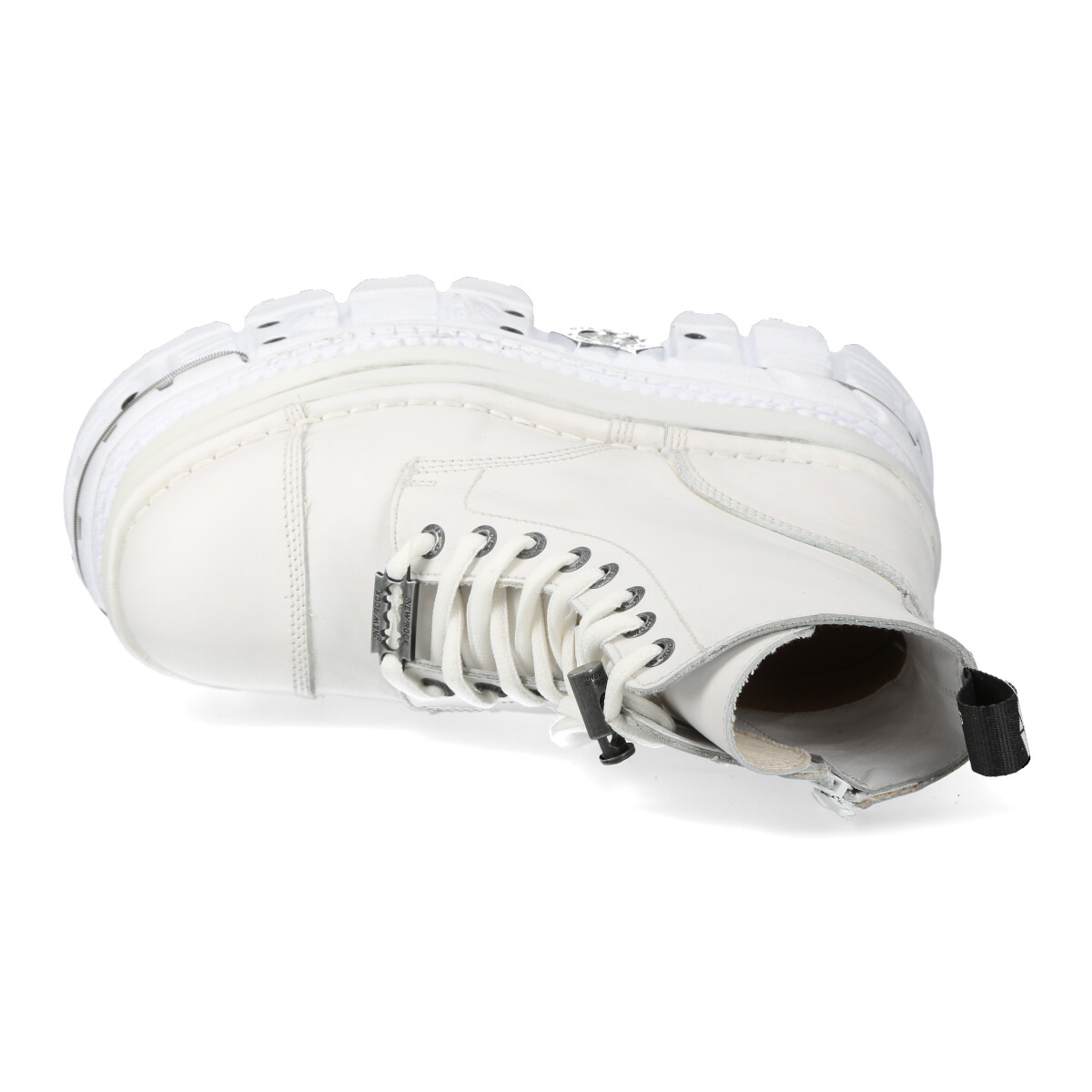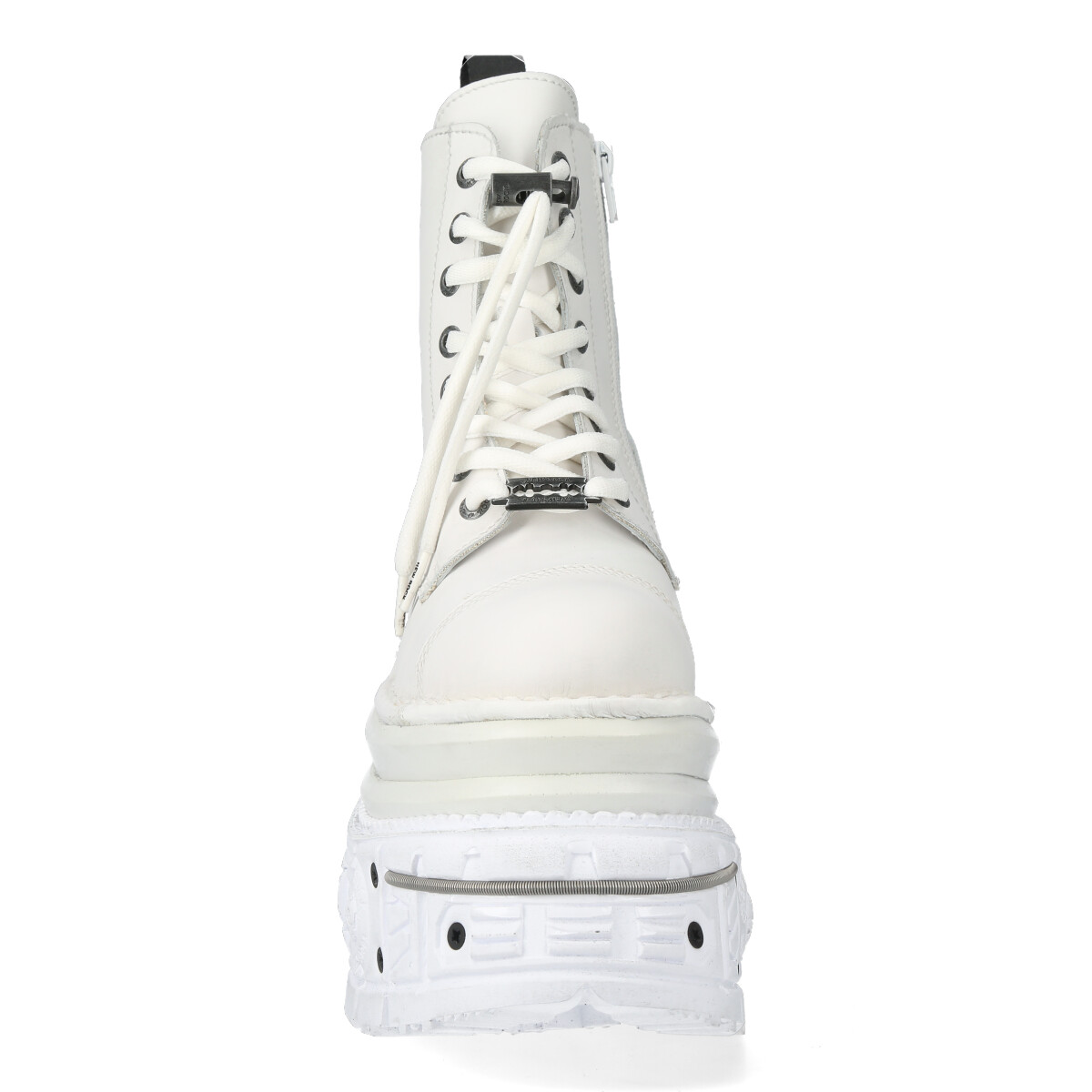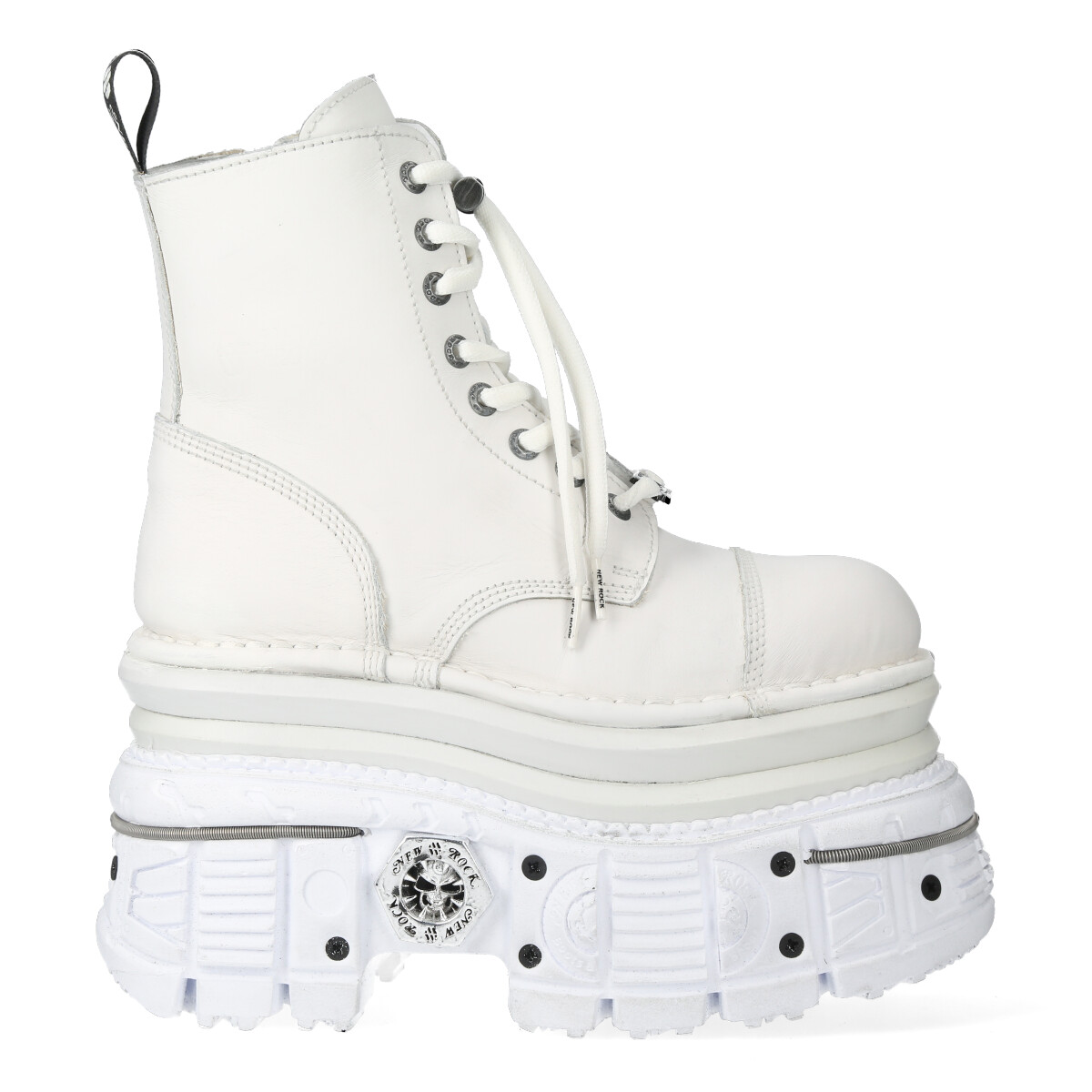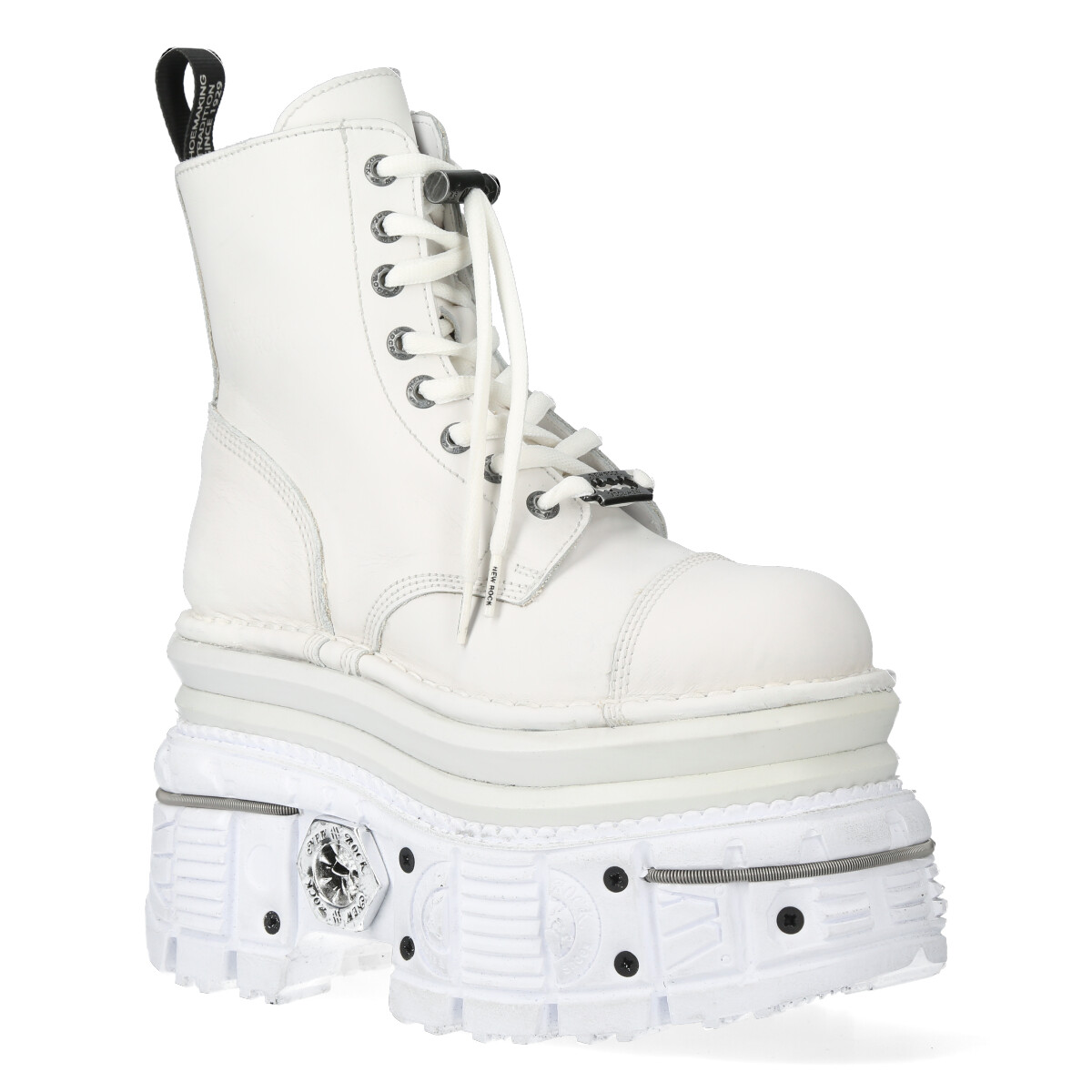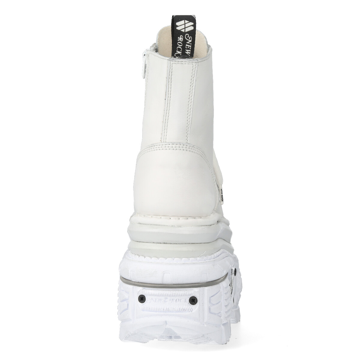 Высокие ботинки New Rock белого цвета для взрослых, модельные, унисекс. Шнурки белого цвета. Подошва New Rock Tank Tower белого цвета с металлическими шурупами вокруг. Материал подошвы PU с выдавленным логотипом New Rock на пятке и в районе свода стопы. Стелька из натуральной кожи бежевого цвета с надписью New Rock. На подошве с задней стороны пластиковый декоративный элемент с логотипом New Rock белого цвета.