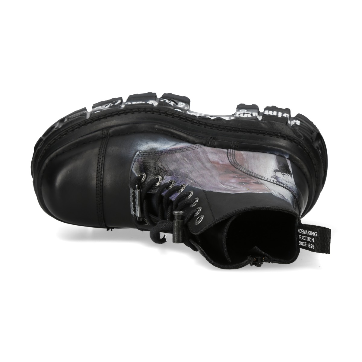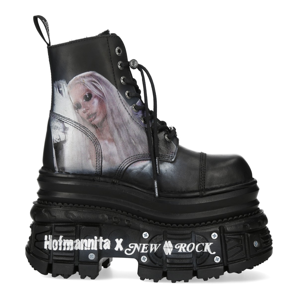 Эксклюзивные лимитированные высокие ботинки в Urbanator - Hofmannita x New Rock. Натуральная кожа черного цвета с принтом, подошва New Rock Tank из полиуретана черного цвета с белым принтом. Шнуровка черного цвета. Сзади ботинка фирменная декоративная деталь с логотипом New Rock черного цвета. В подошву вставлены чёрные шурупы, что делает модель M-MILI083CCT-HOF более дерзкой и стильной.