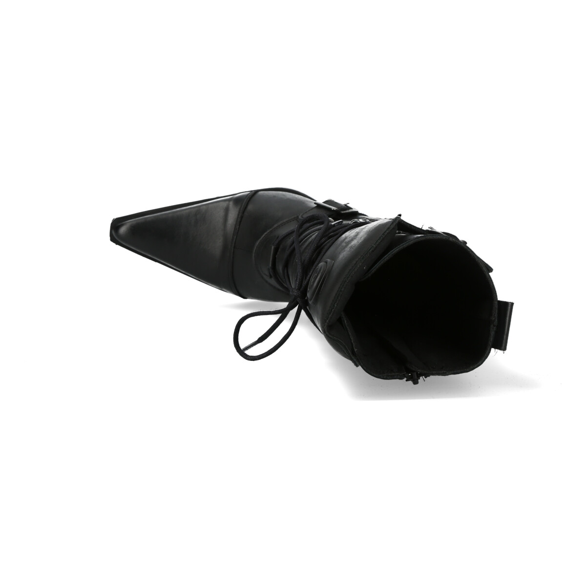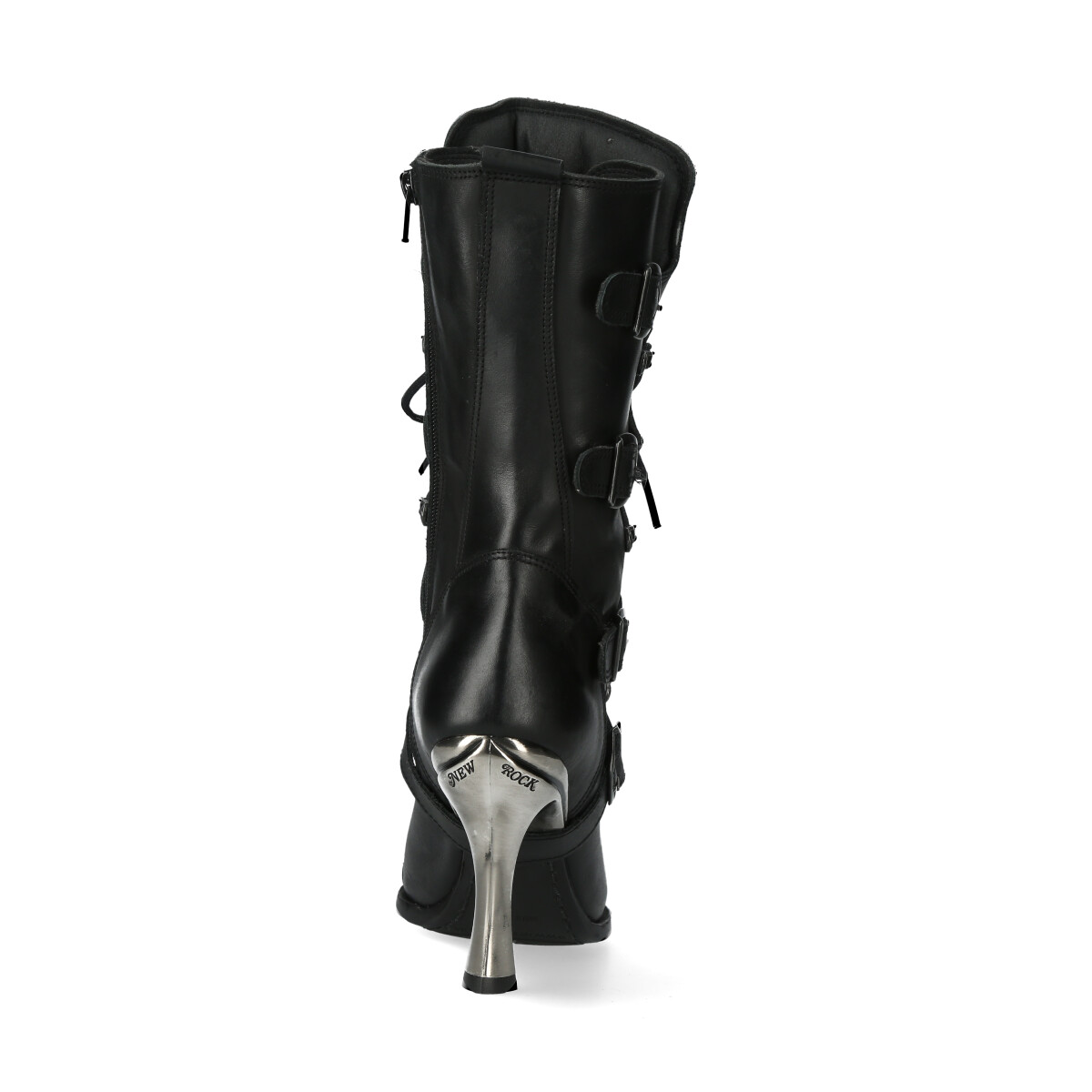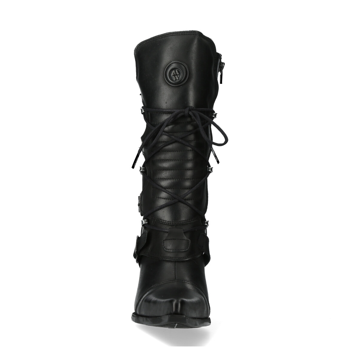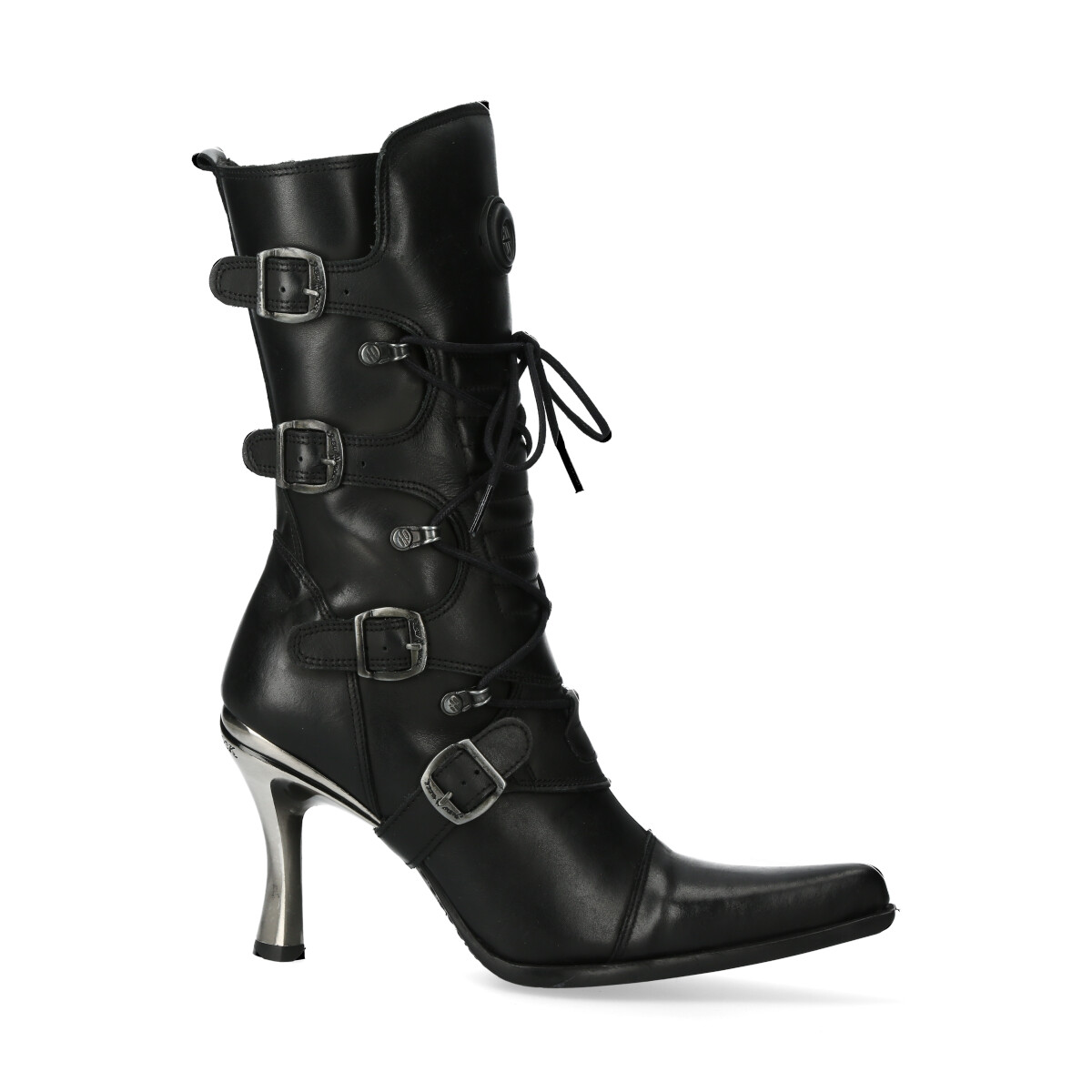 Изящные сапоги на высоком каблуке чёрного цвета на четырех застёжках-ремешках и шнурках от бренда New Rock. На язычке сапога расположен логотип бренда.
