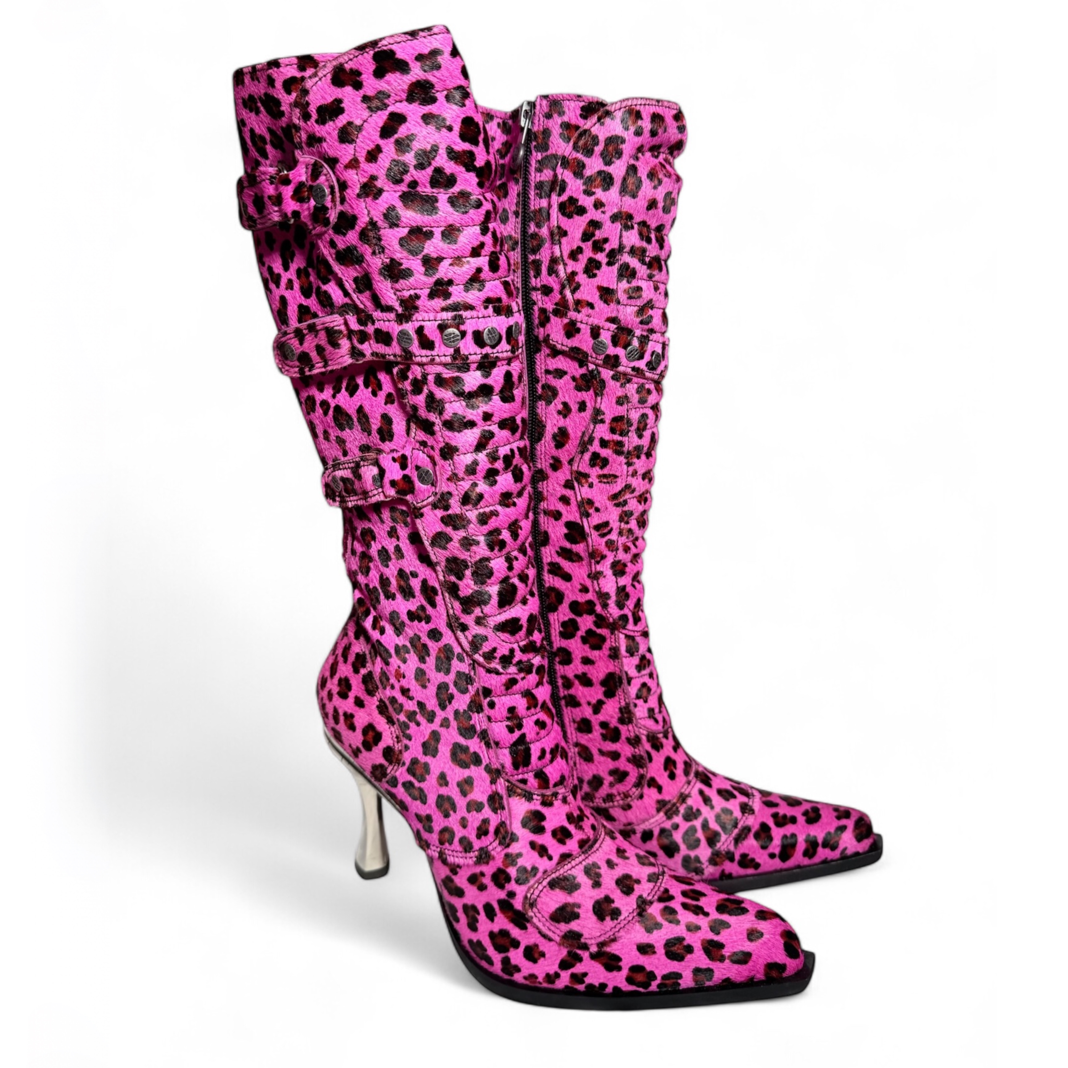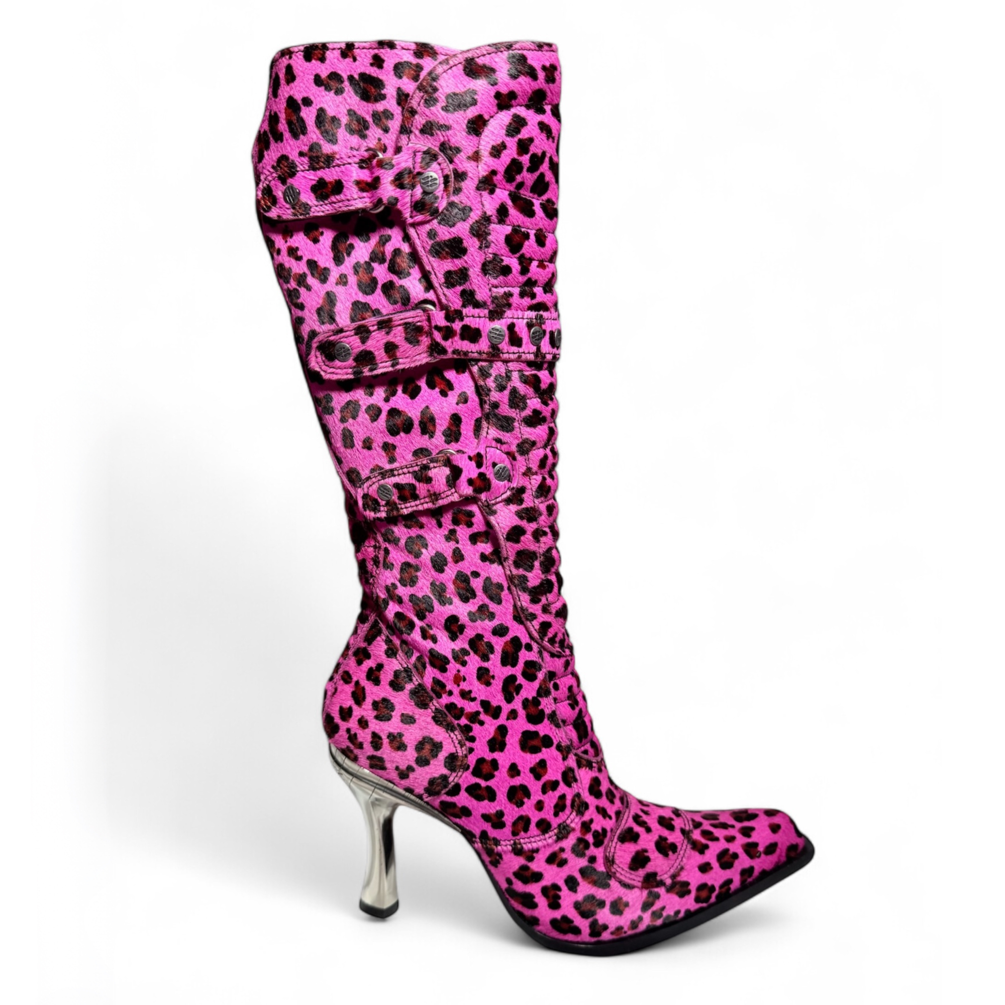 Эффектные сапоги бренда New Rock из натуральной кожи розового цвета с дизайнерскими ремешками. Металлический высокий каблук.