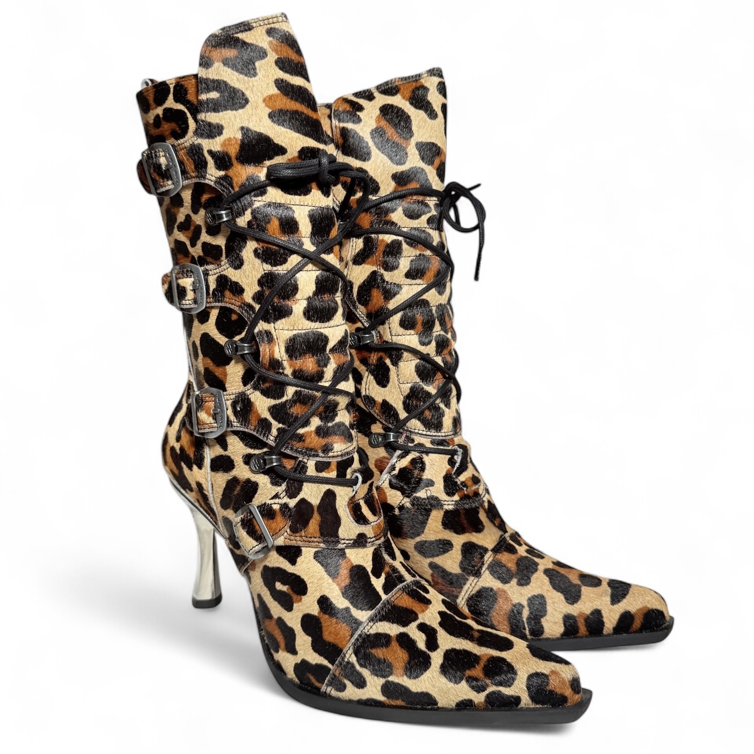 Эффектные сапоги бренда New Rock из натуральной кожи леопардовой расцветки с дизайнерскими ремешками. Металлический высокий каблук.