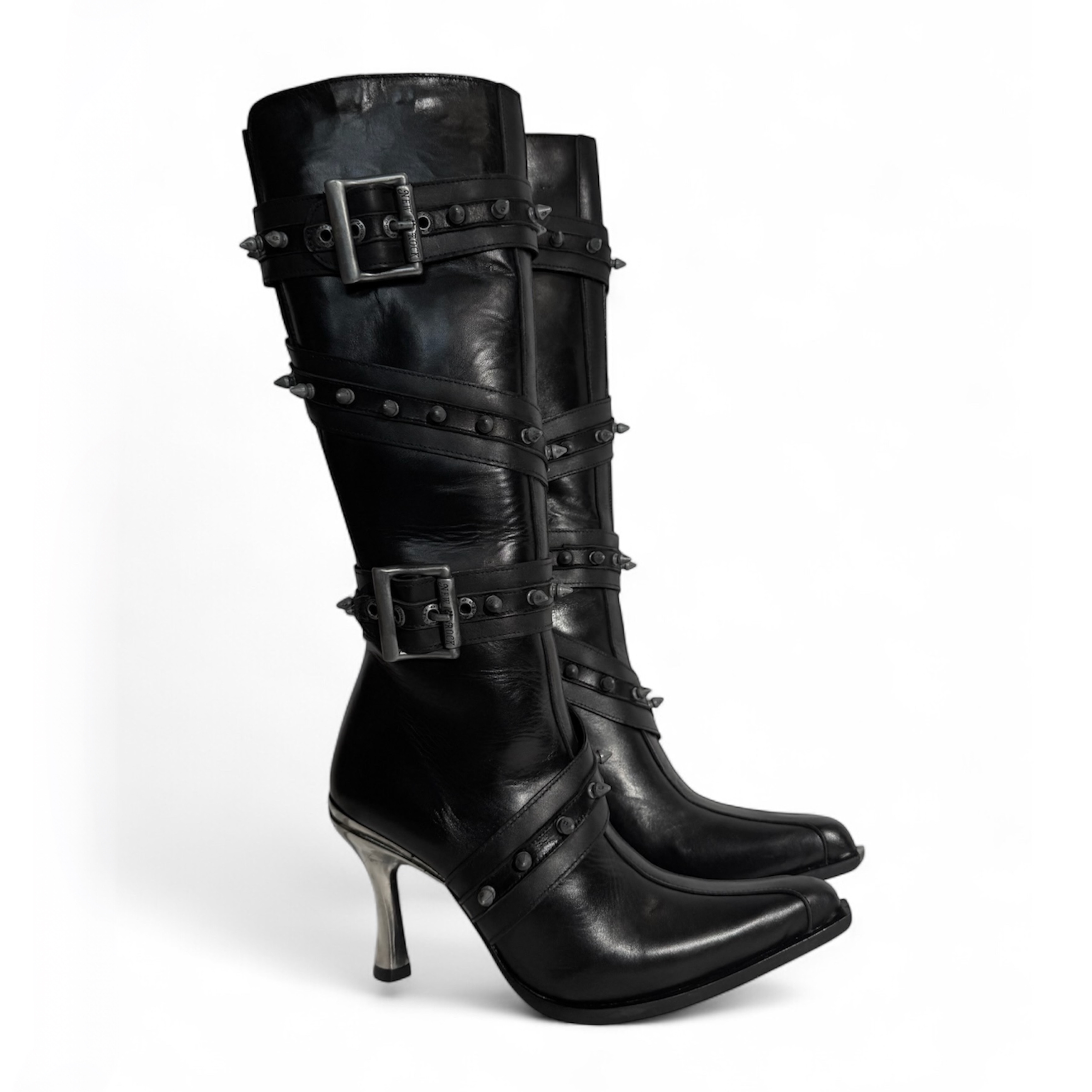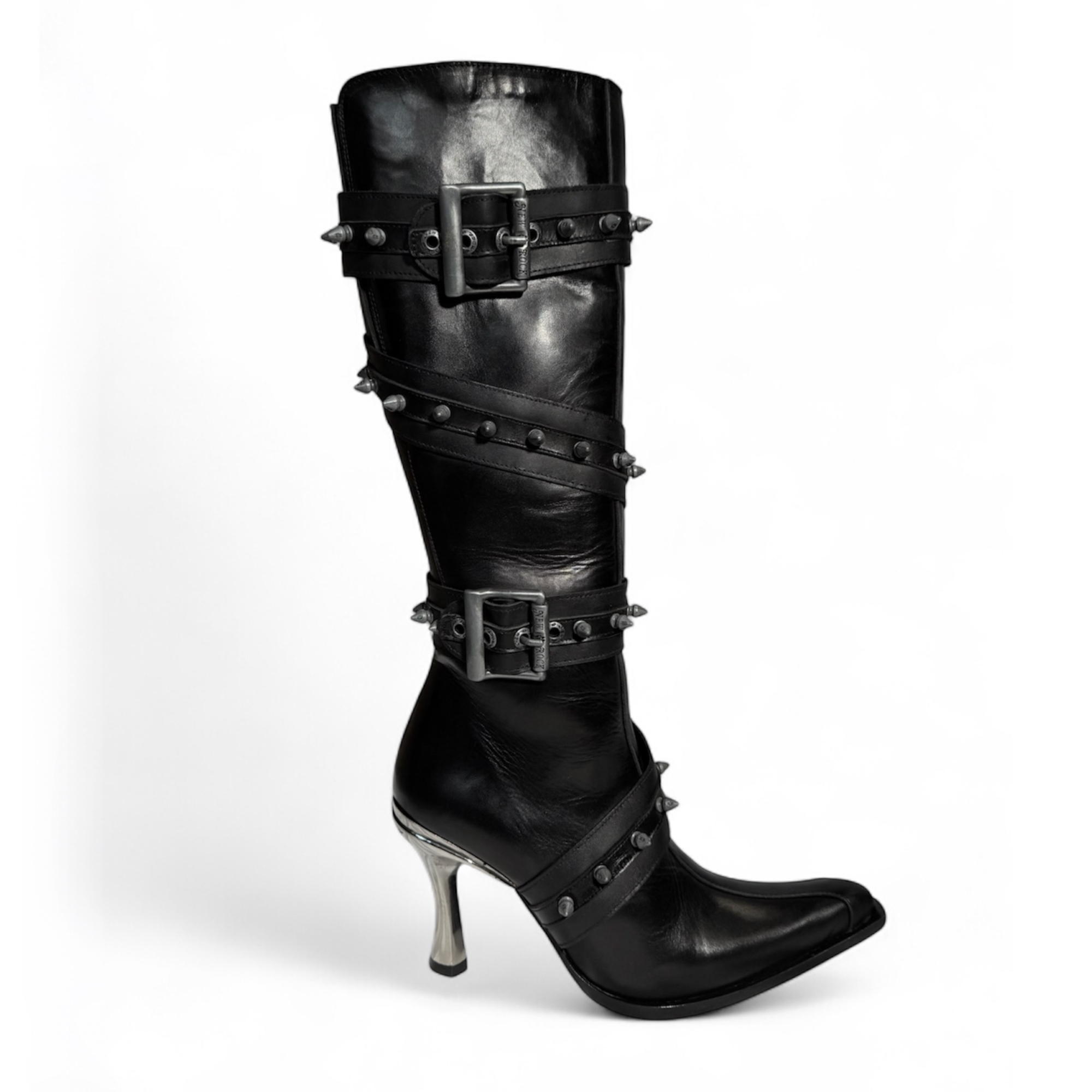 Эффектные сапоги бренда New Rock из натуральной кожи черного цвета с дизайнерскими ремешками и шипами. Металлический высокий каблук.
