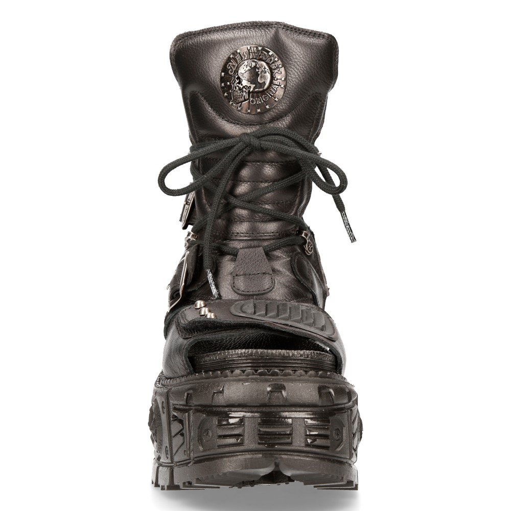 Высокие сандалии New Rock чёрного цвета для взрослых, модельные, унисекс. С тремя металлическими пряжками. Шнурки чёрного цвета. На язычке металлический значок. Массивная подошва New Rock TANK из полиуретана. На подошве выдавлен логотип New Rock. На пятке пластиковый декоративный элемент с логотипом New Rock чёрного цвета.