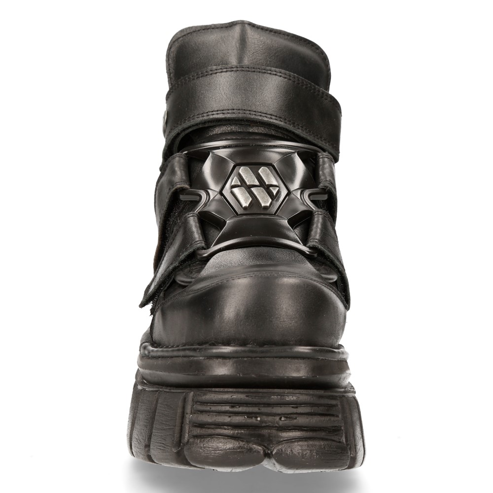 Эффектные кроссовки New Rock на липучках чёрного цвета из натуральной кожи. Подошва New Rock Classic из полиуретана чёрного цвета. На подошве имеются декоративные металлические накладки. Сзади ботинка на пятке находится пластиковое декоративное украшение с названием бренда.