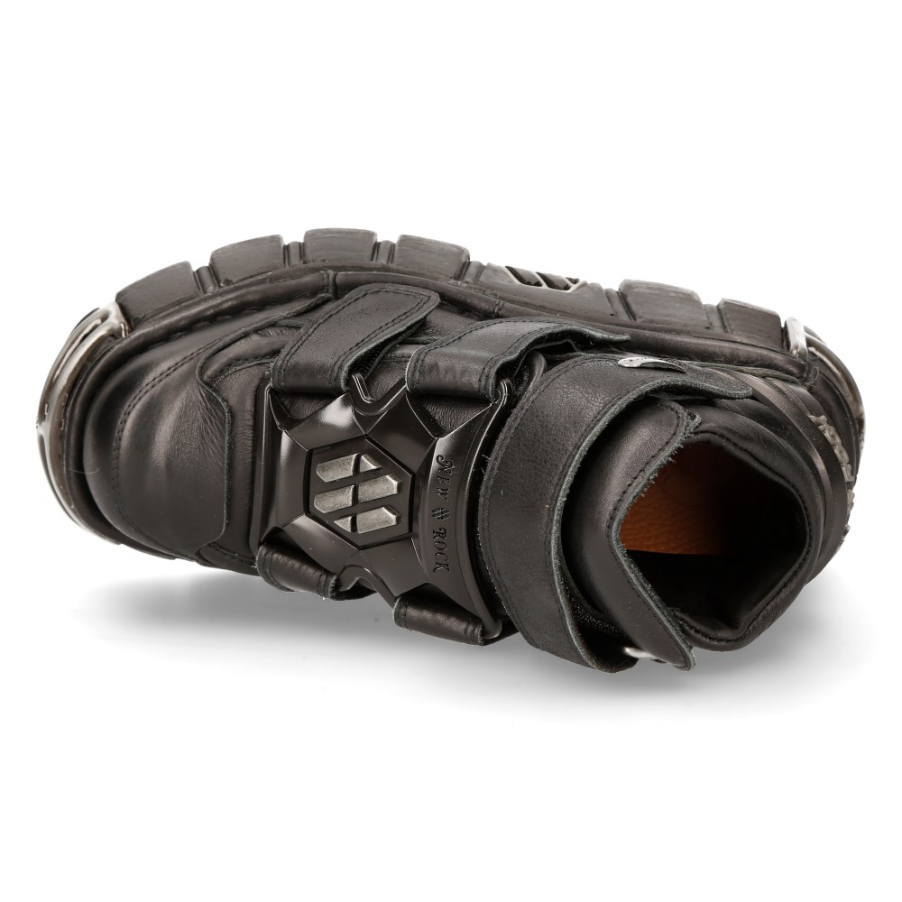 На пятке пластиковый декоративный элемент с логотипом New Rock чёрного цвета. Подошва Tower чёрного цвета. Имеются съемные металлические декоративные элементы на подошве в носочной и пяточной части. Материал подошвы полиуретан с выдавленным логотипом New Rock на пятке и в районе свода стопы.