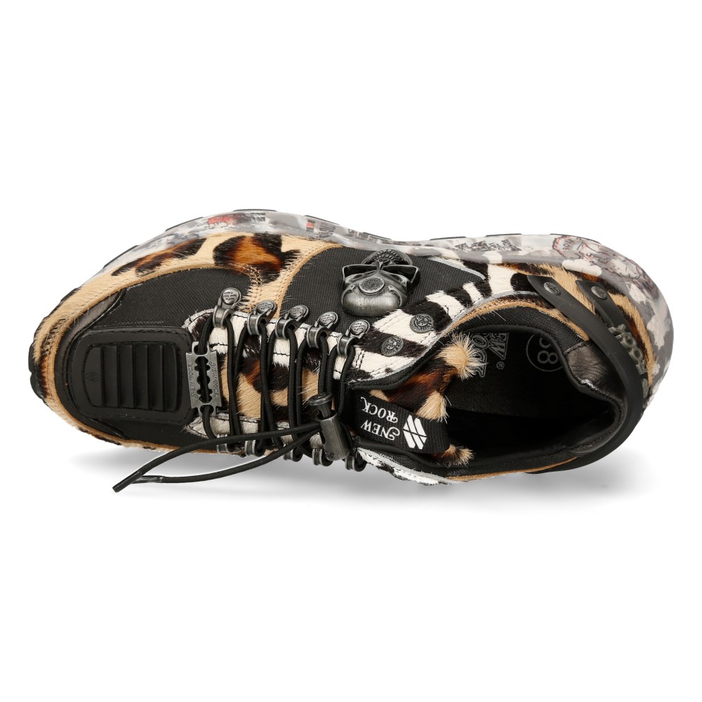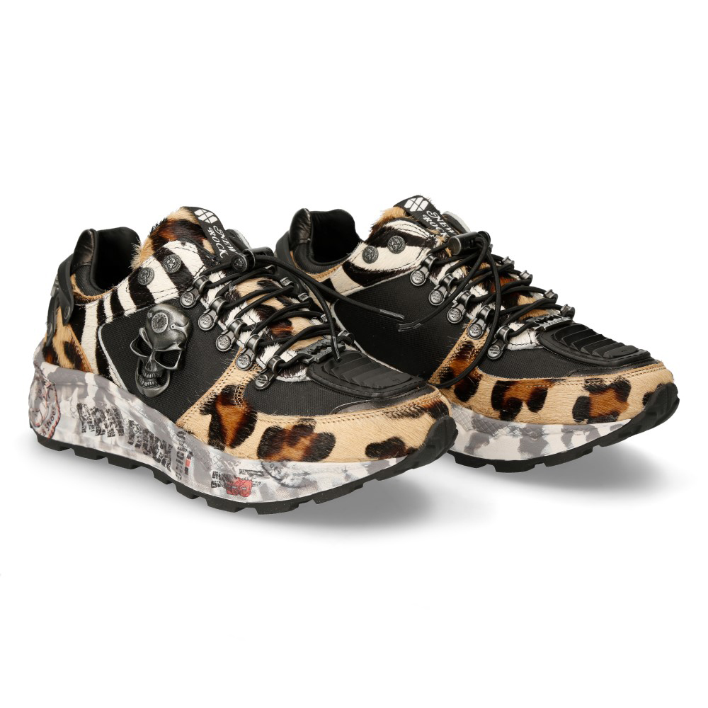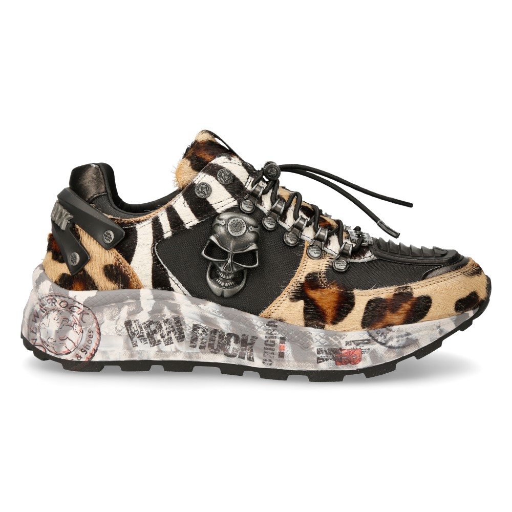 Кроссовки New Rock Classic леопардовой расцветки с эффектными надписями на подошве из коллекции «CHRONO» для взрослых, модельные, унисекс. Подошва New Rock Classic бело-серого цвета, материал полиуретан. Сбоку ботинка расположен большой металлический череп. Шнурки чёрного цвета. На пятке пластиковый декоративный элемент с логотипом New Rock чёрного цвета.