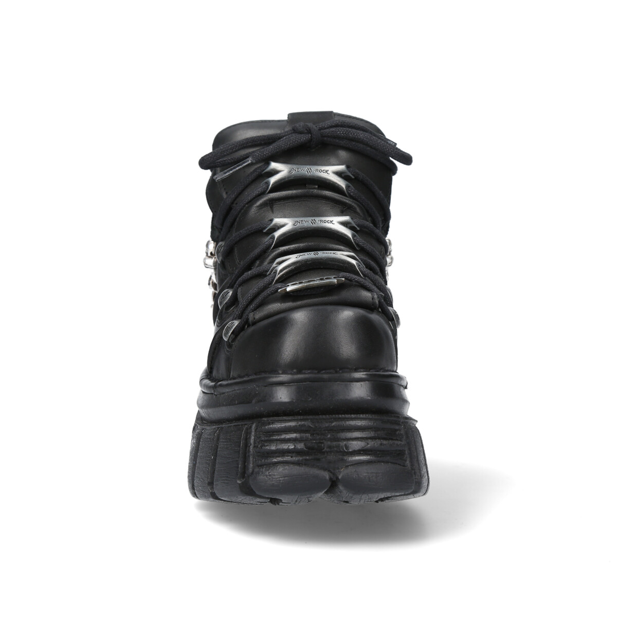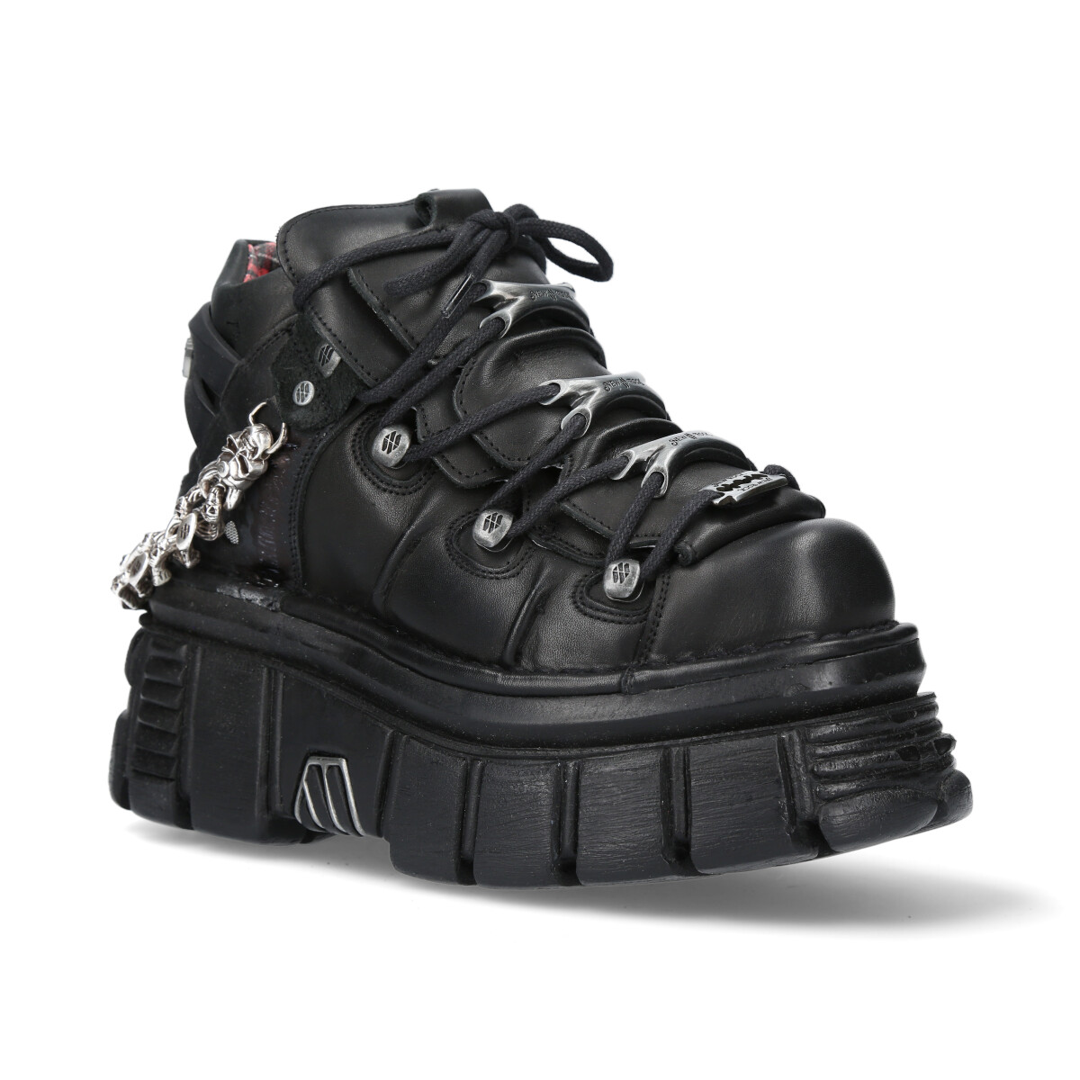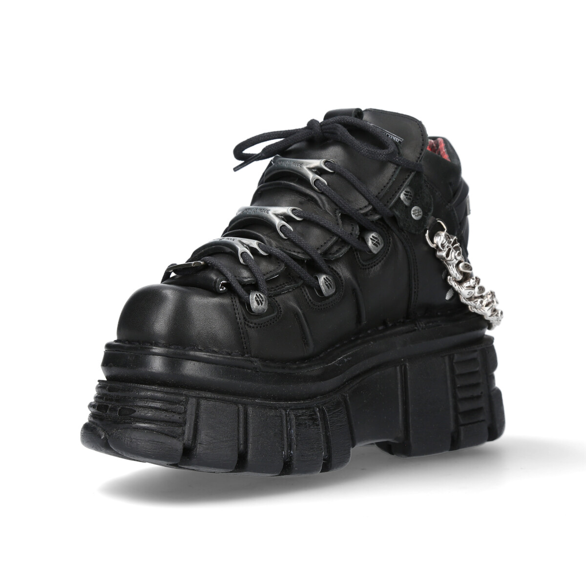 Премиальные кроссовки New Rock коллекции «106» без съемных металлических элементов на подошве из натуральной премиальной кожи чёрного цвета. Кроссовки на шнурках с фиксаторами-крючками с логотипом New Rock. Шнуруются вокруг трех съемных металлических косточек с логотипом New Rock. На пятке пластиковый декоративный элемент в виде логотипа New Rock. Есть съемный металлический декор – бритва на шнуровке, а также толстая металлическая цепь на пятке. Подошва Tower чёрного цвета отличается большей высотой по сравнению с подошвой Classic. Материал подошвы PU. На подошве выдавлена печать с логотипом New Rock. Стелька из натуральной кожи, отделка из натуральной кожи цвета тартан.