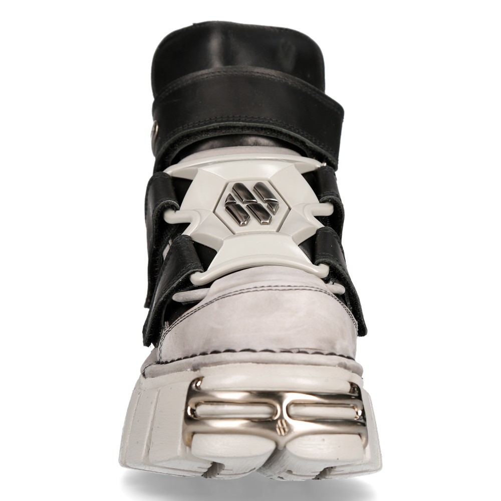Эффектные кроссовки New Rock черно-серого цвета из натуральной кожи для взрослых, модельные, унисекс. Застежки - липучки черного цвета, крепящиеся на пластиковой накладке. Массивная подошва бежевого цвета New Rock Classic из полиуретана. На пятке кроссовка находится пластиковое украшение с названием бренда бежевого цвета. На подошве имеются металлические накладки.