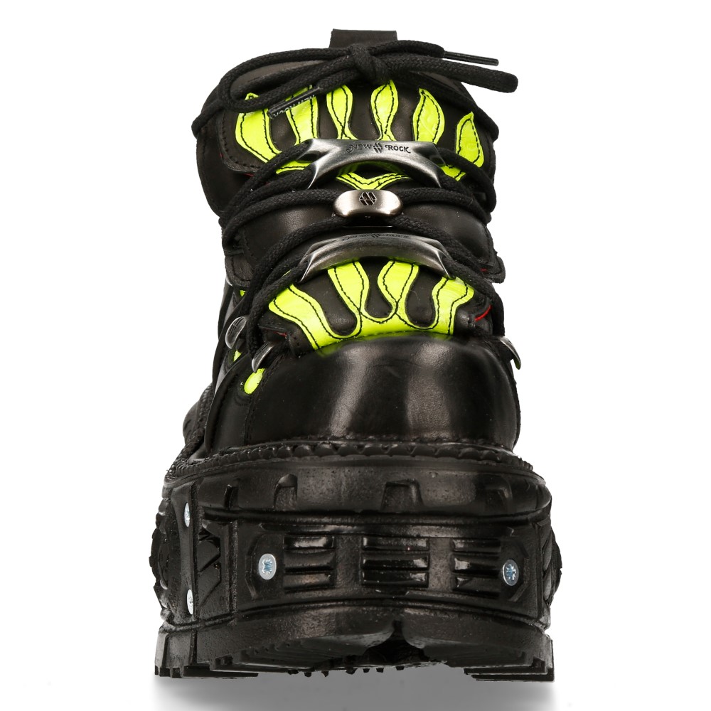 Эффектные кроссовки New Rock чёрного цвета из натуральной кожи для взрослых, модельные, унисекс. Шнурки чёрного цвета, крепятся на трёх косточках. Массивная подошва чёрного цвета New Rock TANK из полиуретана. На пятке кроссовка находится пластиковое украшение с названием бренда чёрного цвета. На подошве имеются металлические накладки.