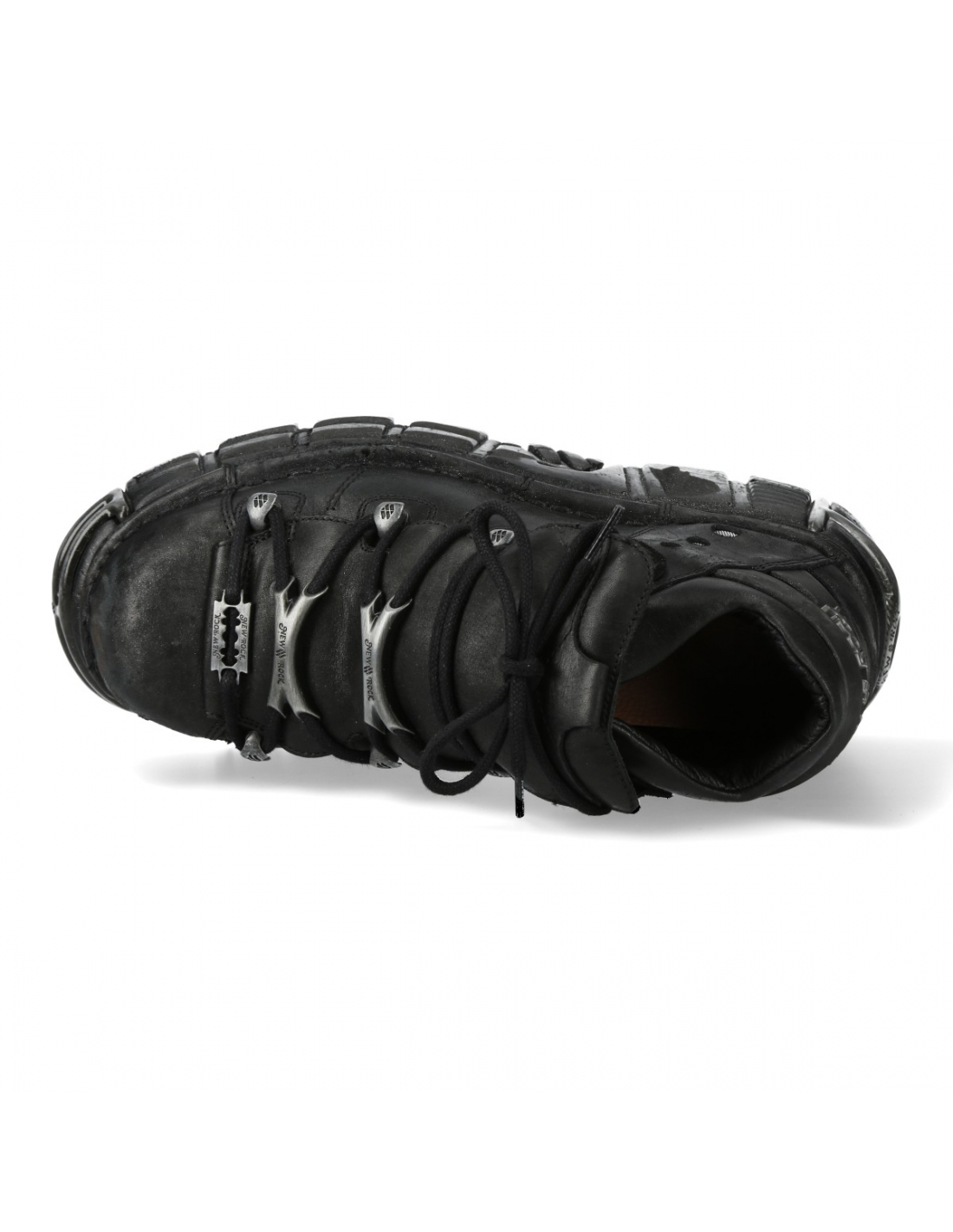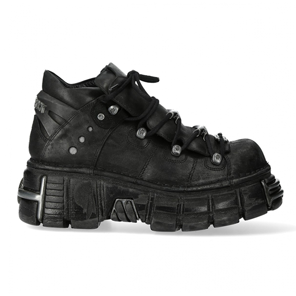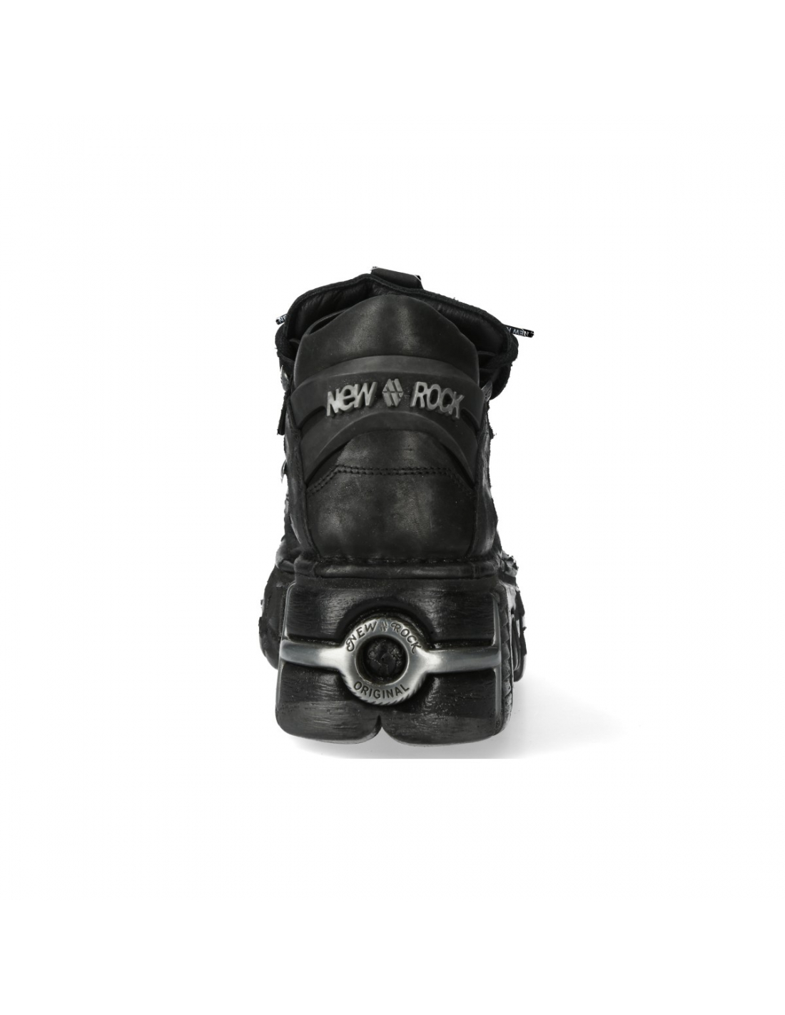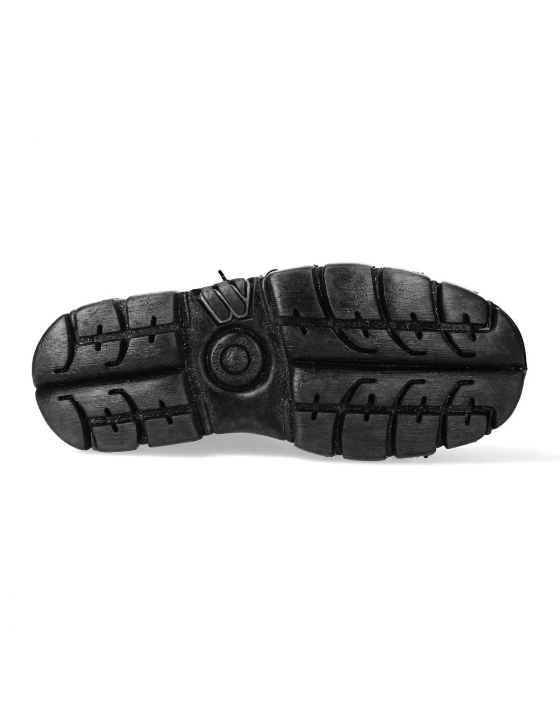 Эффектные кроссовки New Rock чёрного цвета из натуральной кожи для взрослых, модельные, унисекс. Шнурки чёрного цвета, крепятся на двух косточках. Массивная подошва чёрного цвета New Rock Classic из полиуретана. На пятке кроссовка находится пластиковое украшение с названием бренда чёрного цвета. На подошве имеются металлические накладки.