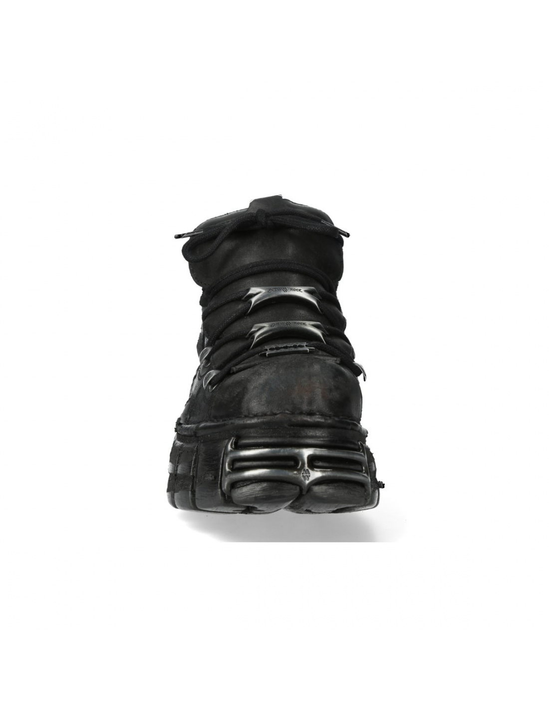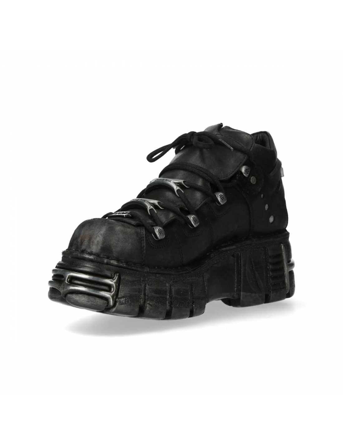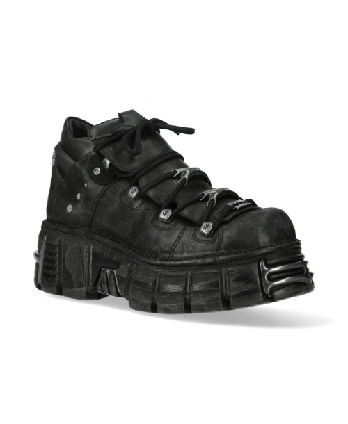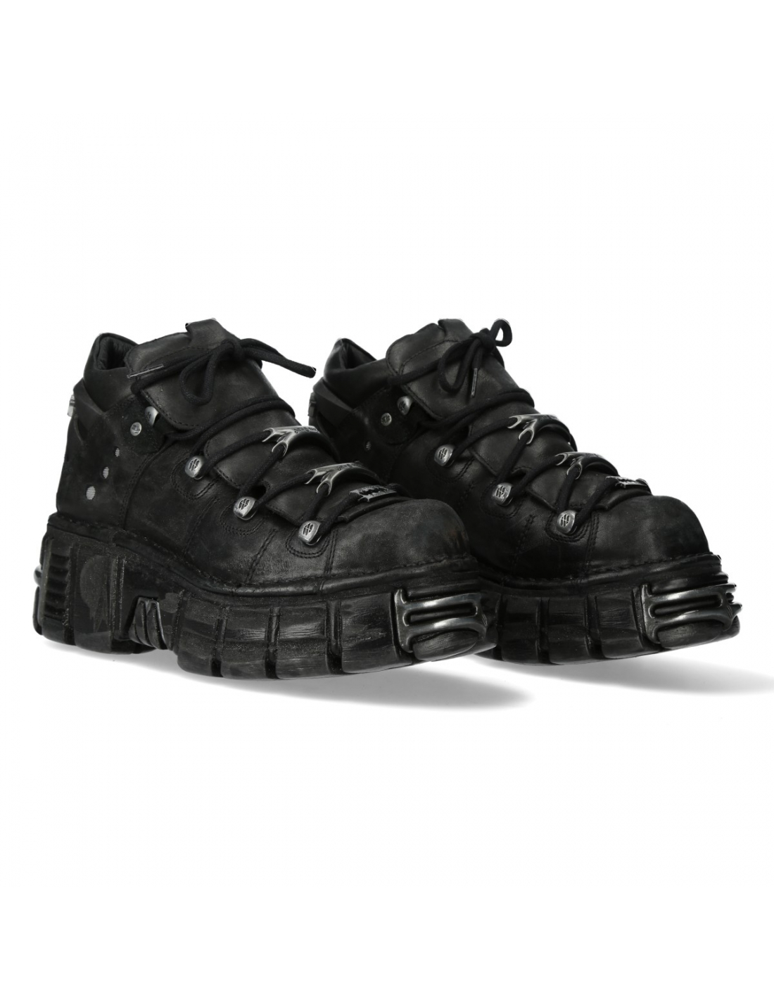 Эффектные кроссовки New Rock чёрного цвета из натуральной кожи для взрослых, модельные, унисекс. Шнурки чёрного цвета, крепятся на двух косточках. Массивная подошва чёрного цвета New Rock Classic из полиуретана. На пятке кроссовка находится пластиковое украшение с названием бренда чёрного цвета. На подошве имеются металлические накладки.