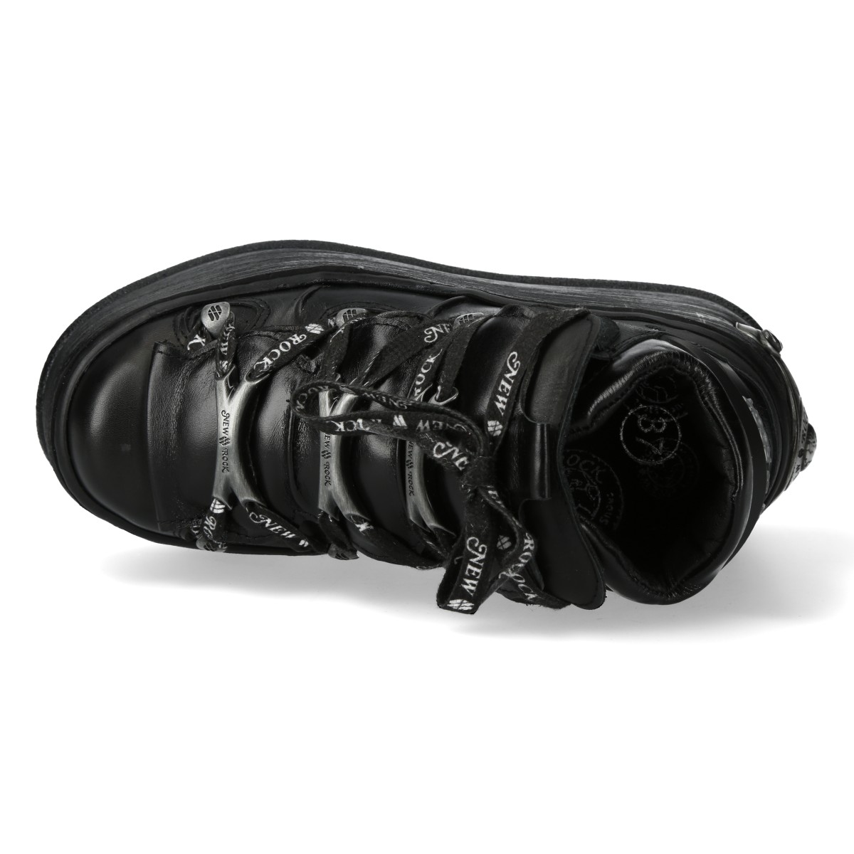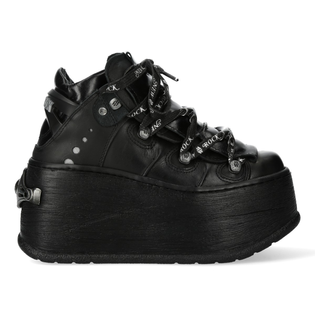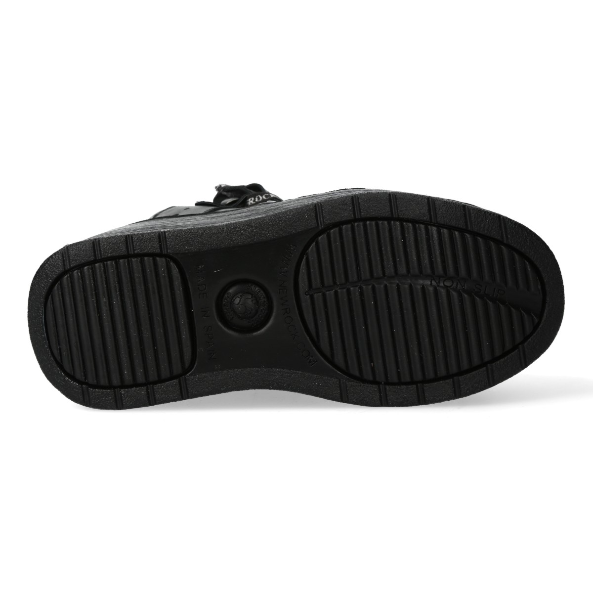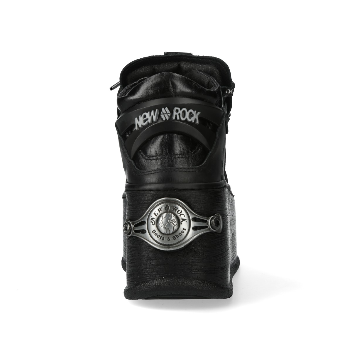 Эффектные кроссовки New Rock чёрного цвета из натуральной кожи для взрослых, модельные, унисекс. Шнурки чёрного цвета, крепятся на трёх косточках. Массивная подошва чёрного цвета New Rock из полиуретана. На пятке кроссовка находится пластиковое украшение с названием бренда чёрного цвета. На подошве имеются металлические накладки.