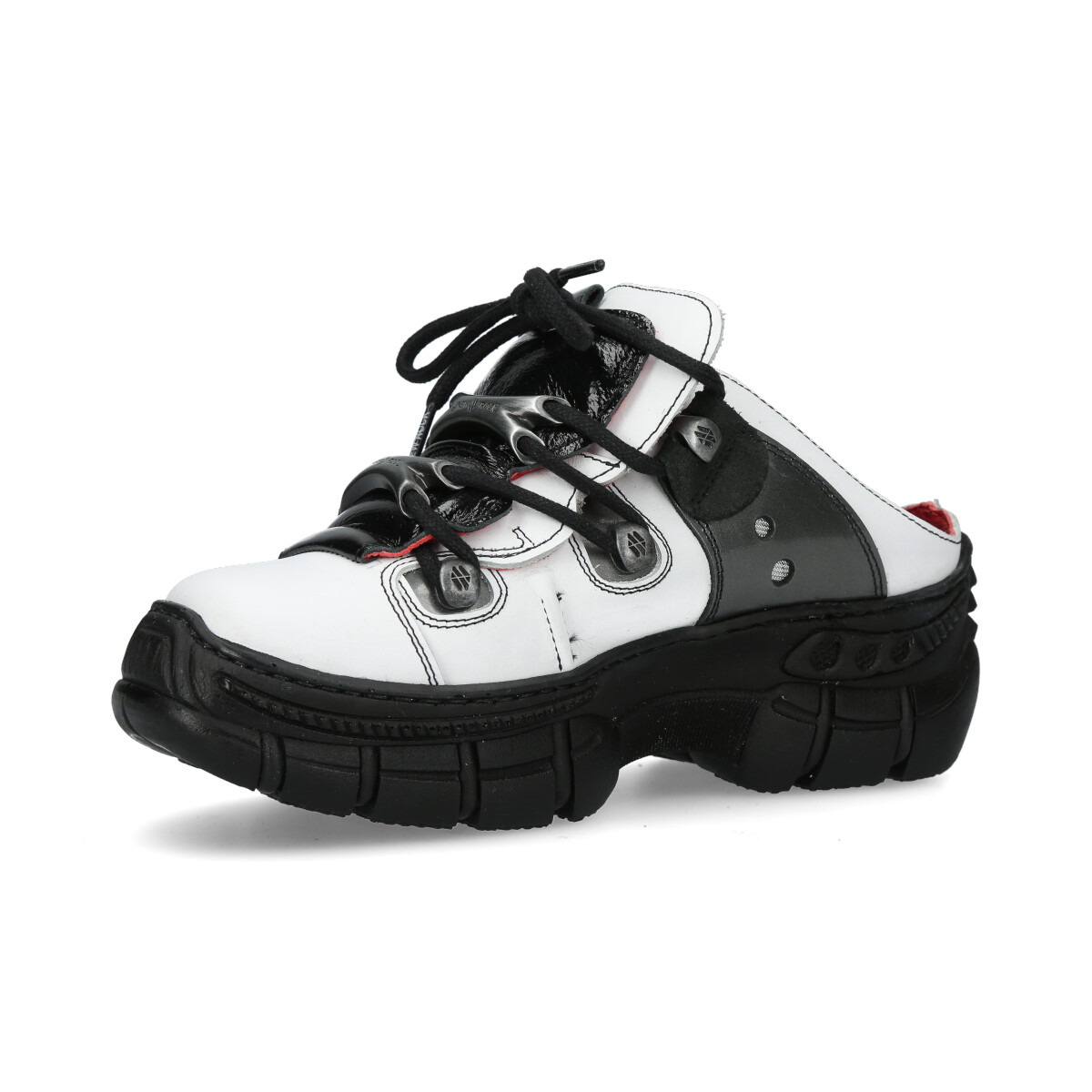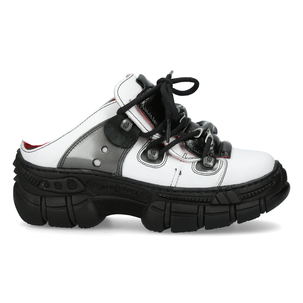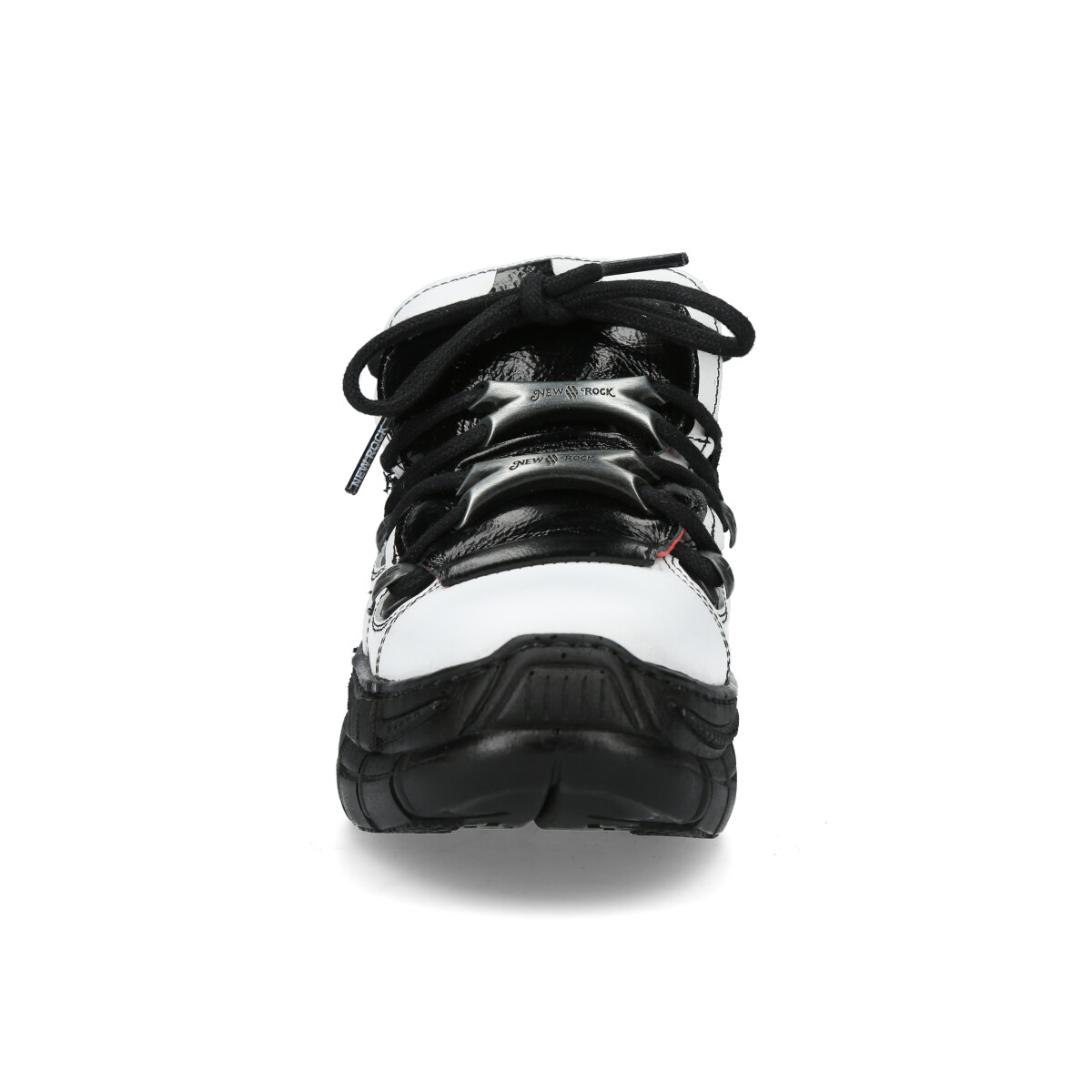 Эффектные сандалии New Rock белого цвета из натуральной кожи для взрослых, модельные, унисекс. Шнурки чёрного цвета, крепятся на трёх косточках. Массивная подошва чёрного цвета из полиуретана.