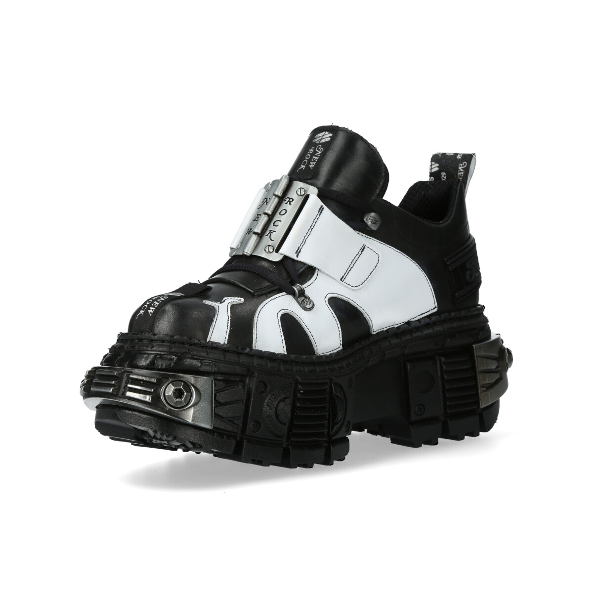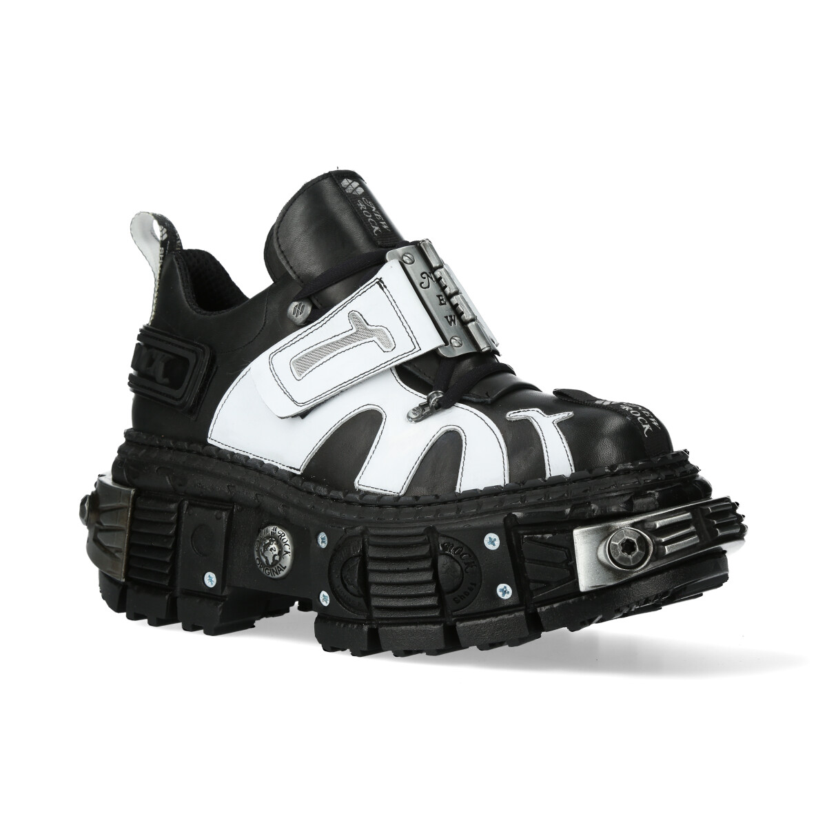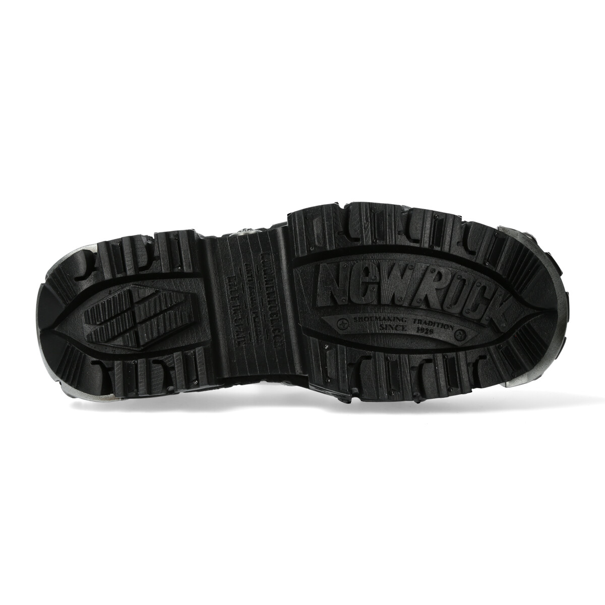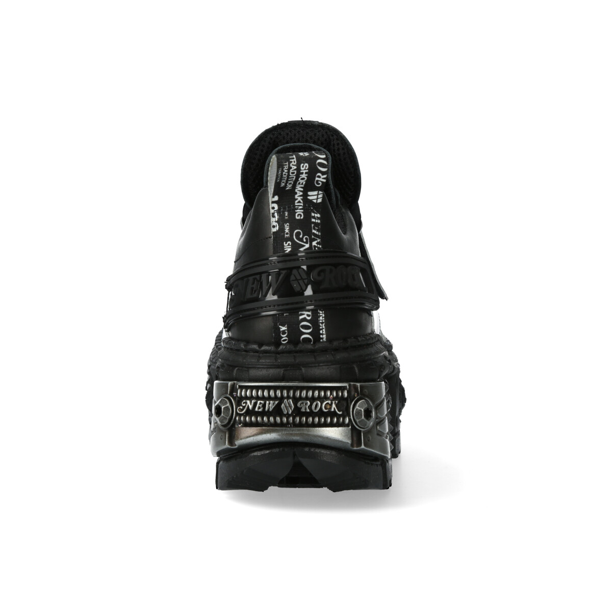 Эффектные кроссовки New Rock чёрного цвета из натуральной кожи для взрослых, модельные, унисекс. Застежка - липучка. Массивная подошва чёрного цвета New Rock Wall из полиуретана. На пятке кроссовка находится пластиковое украшение с названием бренда чёрного цвета. На подошве имеются металлические накладки.