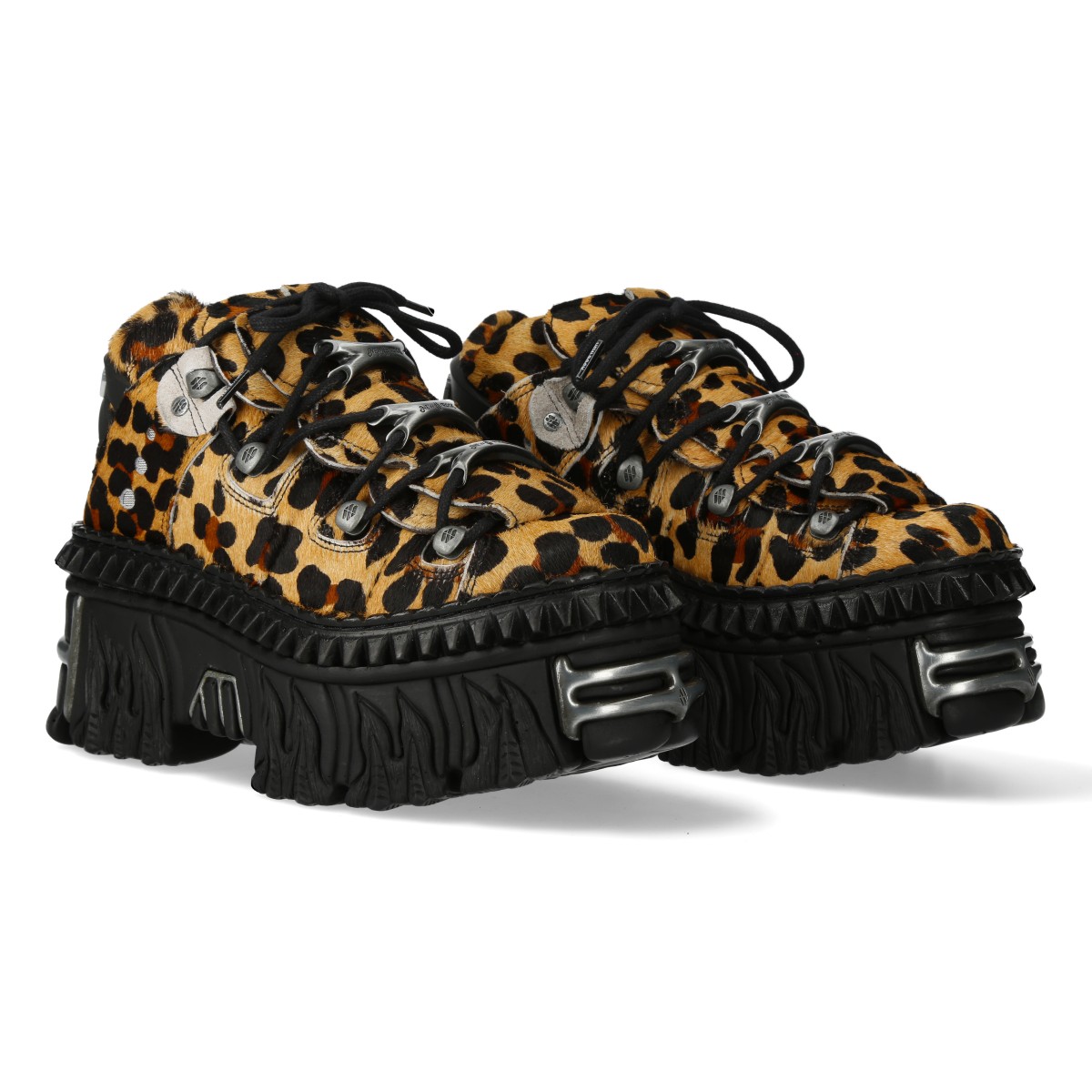 Эффектные кроссовки New Rock леопардового цвета из натуральной кожи для взрослых, модельные, унисекс. Шнурки чёрного цвета, крепятся на крючках. Массивная подошва чёрного цвета New Rock Flame из полиуретана. На подошве имеются металлические накладки. На пятке пластиковый элемент с названием бренда