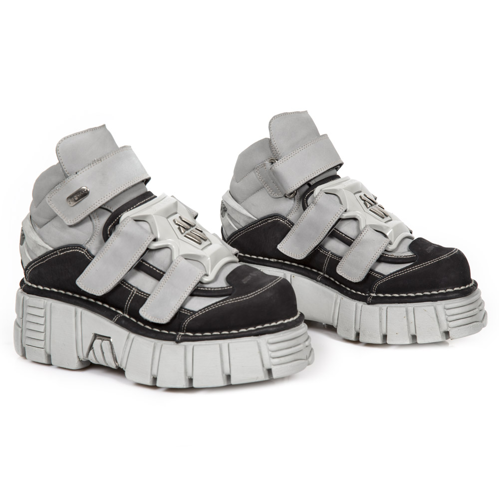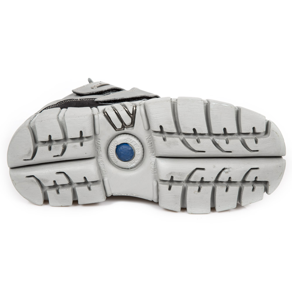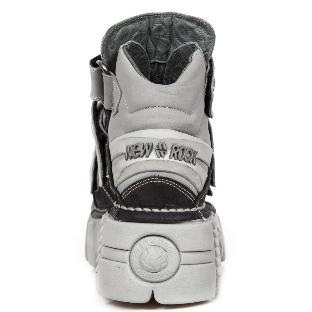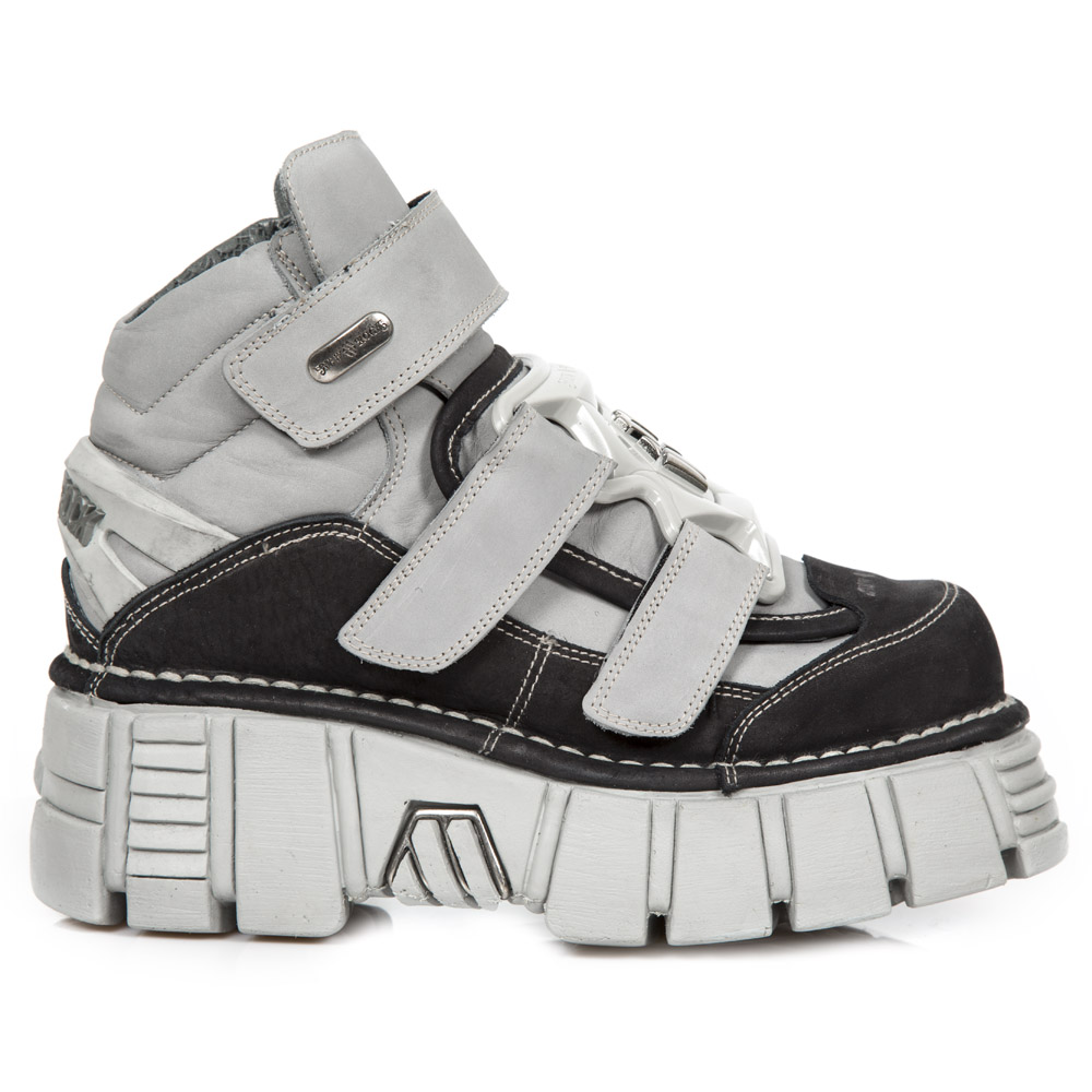 Эффектные кроссовки New Rock бежево-черного цвета из натуральной кожи для взрослых, модельные, унисекс. На липучках. Массивная подошва чёрного цвета New Rock Classic из полиуретана. На подошве имеются металлические накладки. Сзади ботинка на пятке находится декоративный элемент с названием бренда
