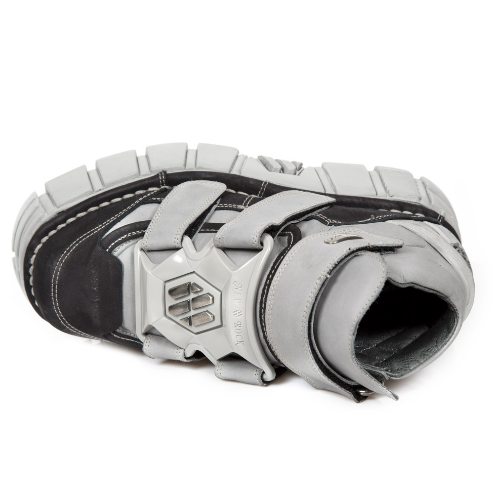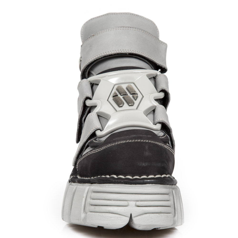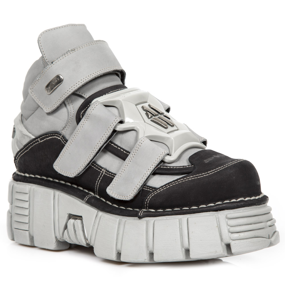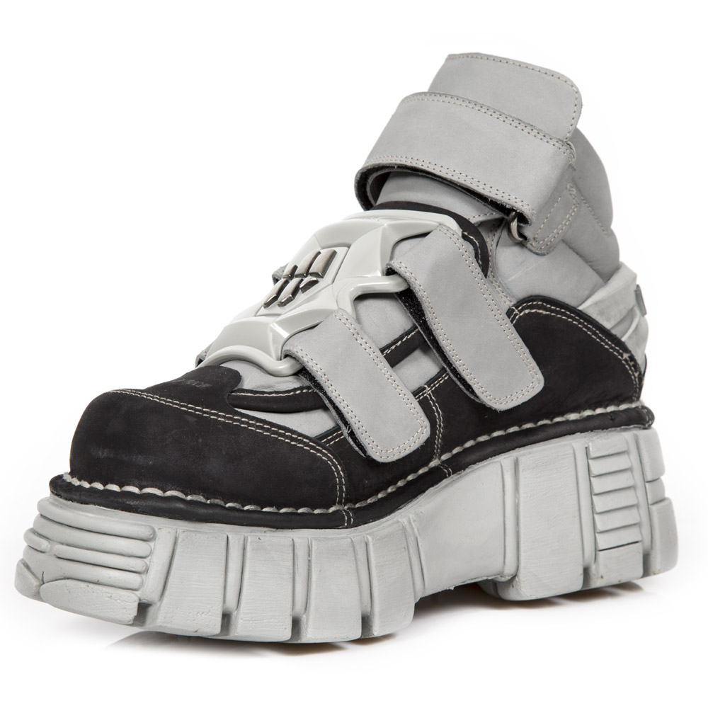 Эффектные кроссовки New Rock бежево-черного цвета из натуральной кожи для взрослых, модельные, унисекс. На липучках. Массивная подошва чёрного цвета New Rock Classic из полиуретана. На подошве имеются металлические накладки. Сзади ботинка на пятке находится декоративный элемент с названием бренда