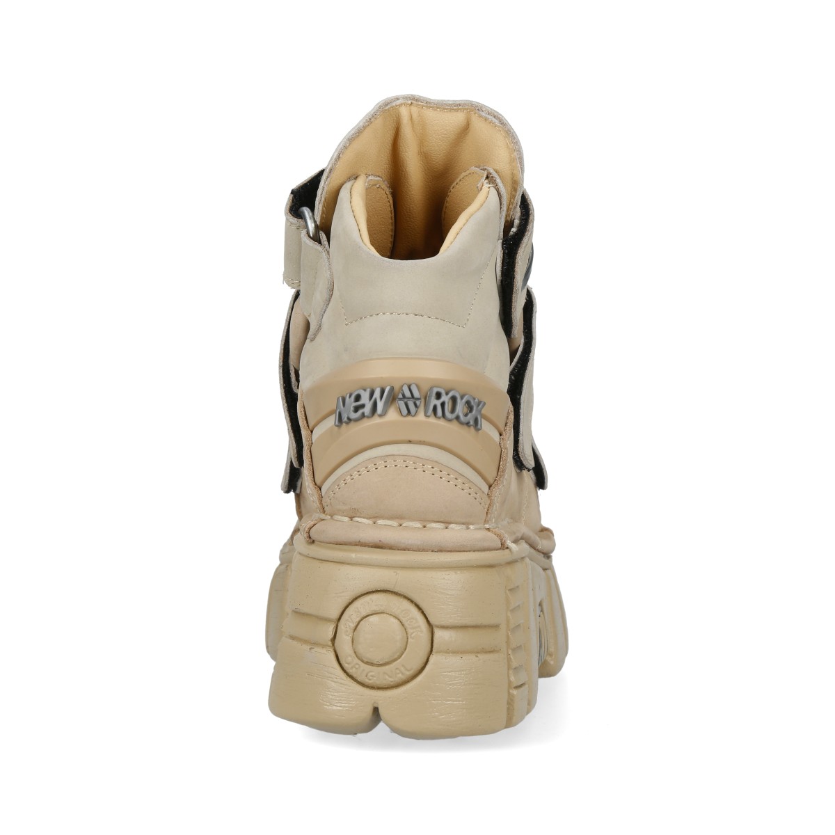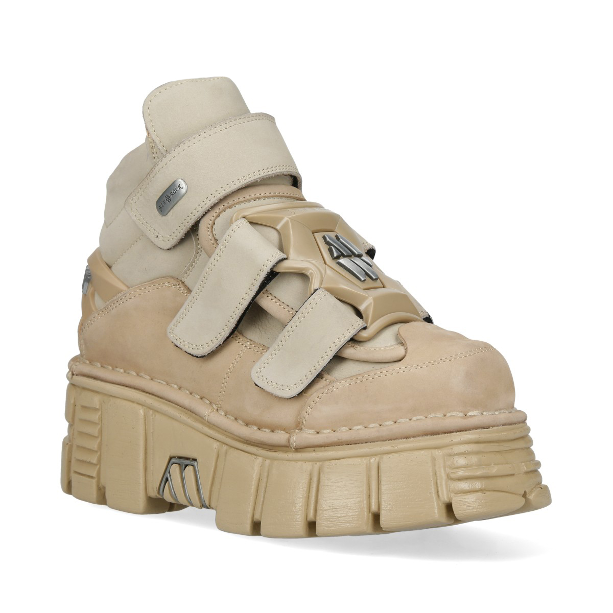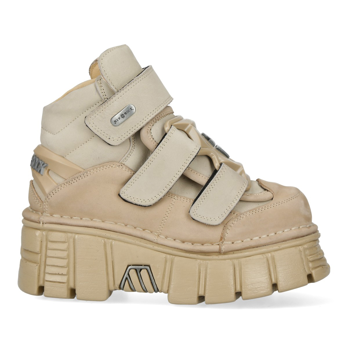 Эффектные кроссовки New Rock на липучках чёрного бежевого цвета из натуральной кожи. Подошва New Rock Classic из полиуретана бежевого цвета. На подошве имеются декоративные металлические накладки. Сзади ботинка на пятке находится пластиковое декоративное украшение с названием бренда.