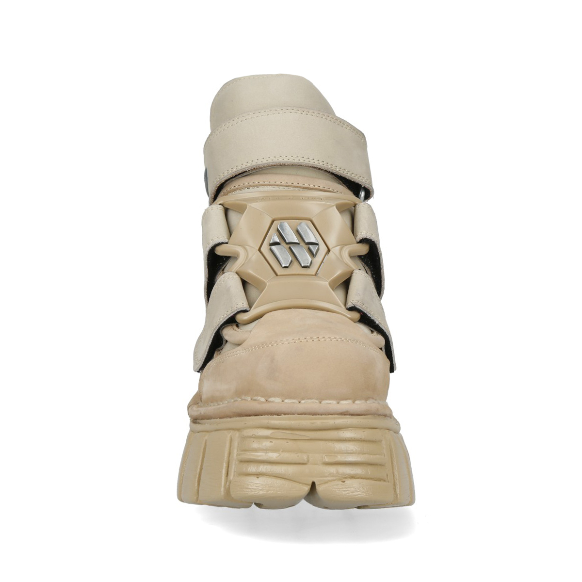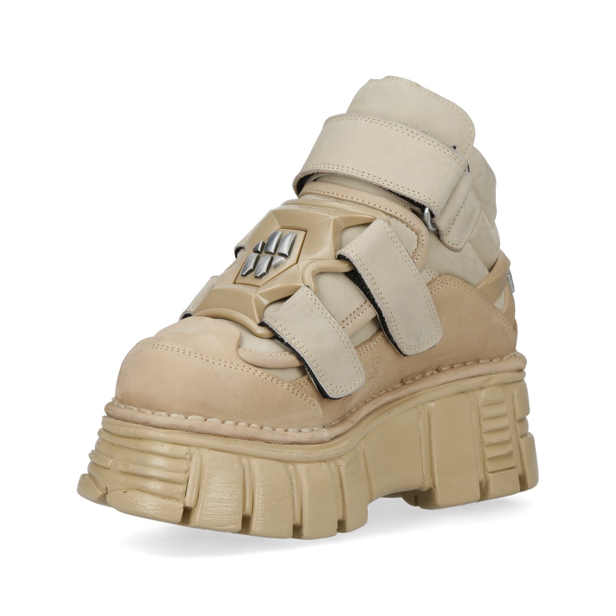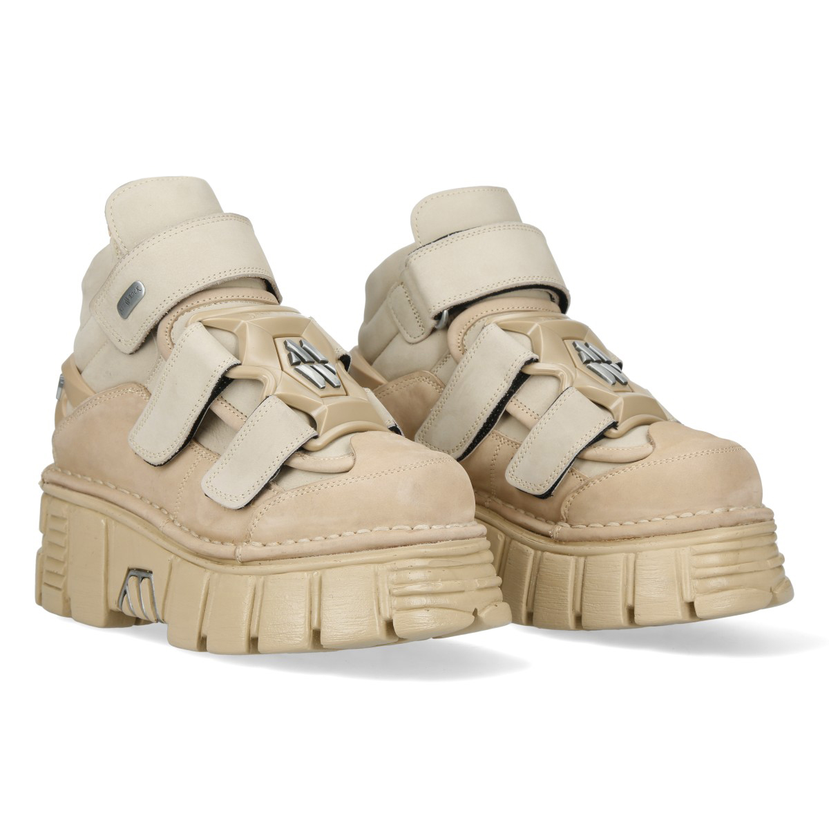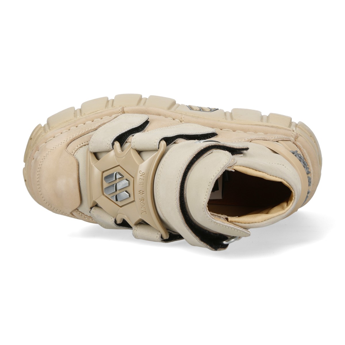 Эффектные кроссовки New Rock на липучках чёрного бежевого цвета из натуральной кожи. Подошва New Rock Classic из полиуретана бежевого цвета. На подошве имеются декоративные металлические накладки. Сзади ботинка на пятке находится пластиковое декоративное украшение с названием бренда.