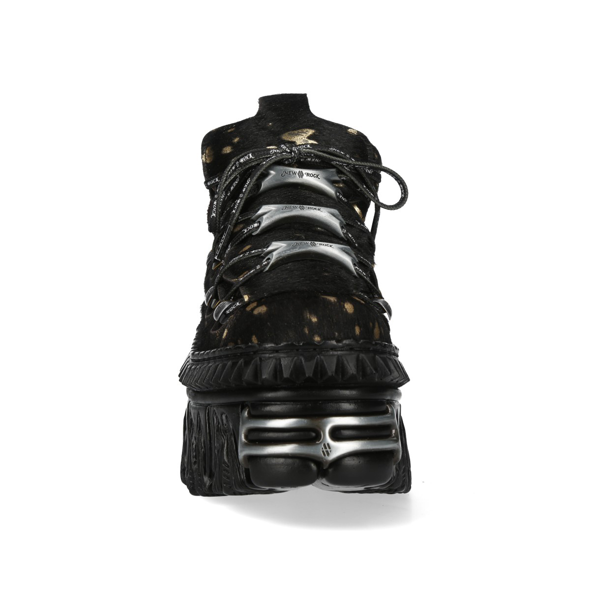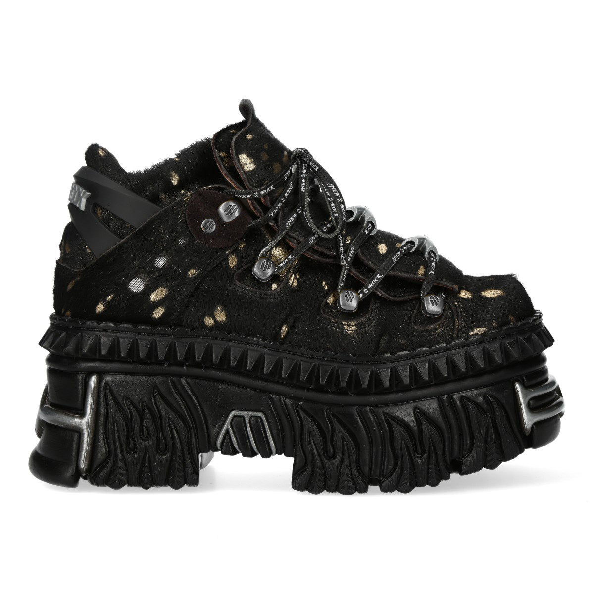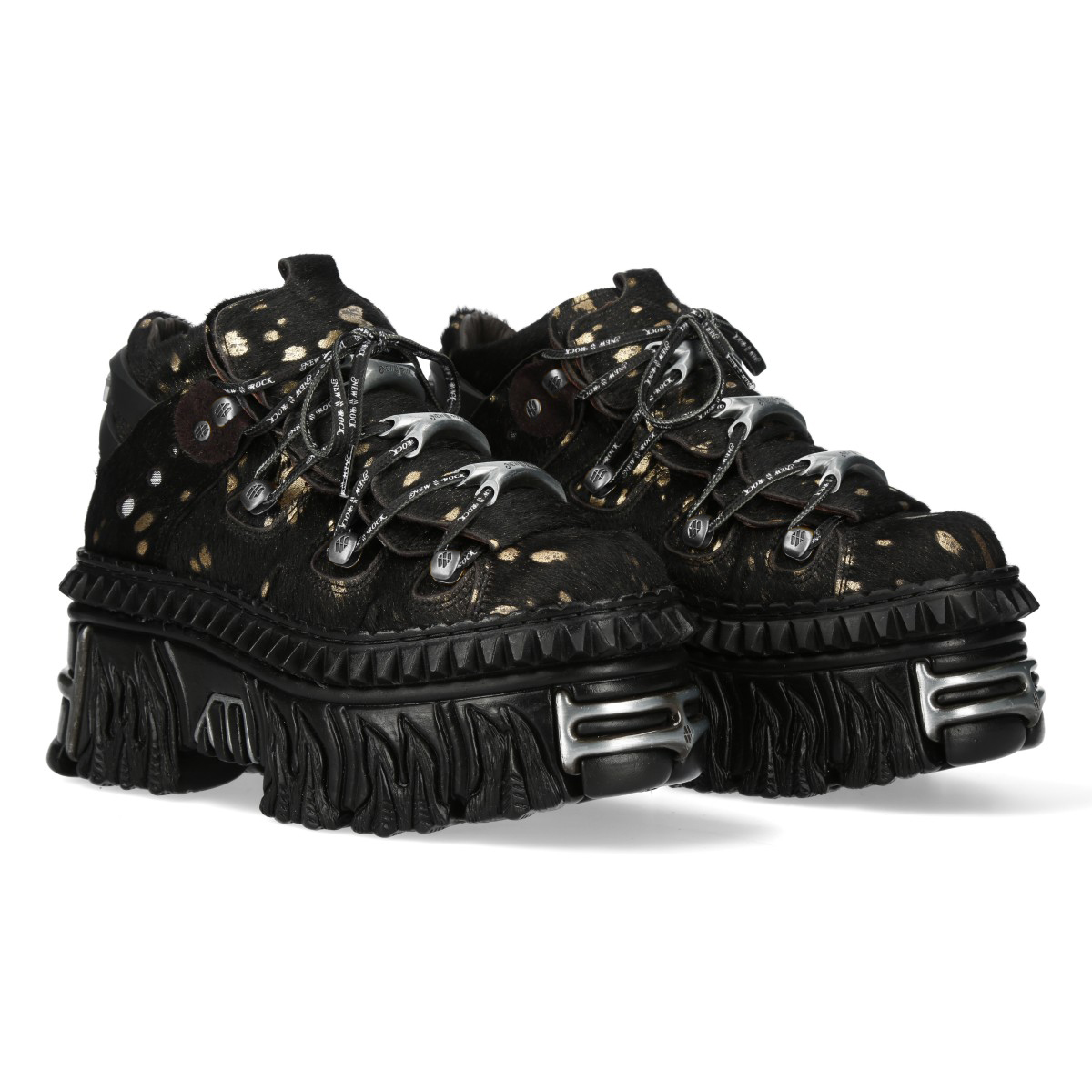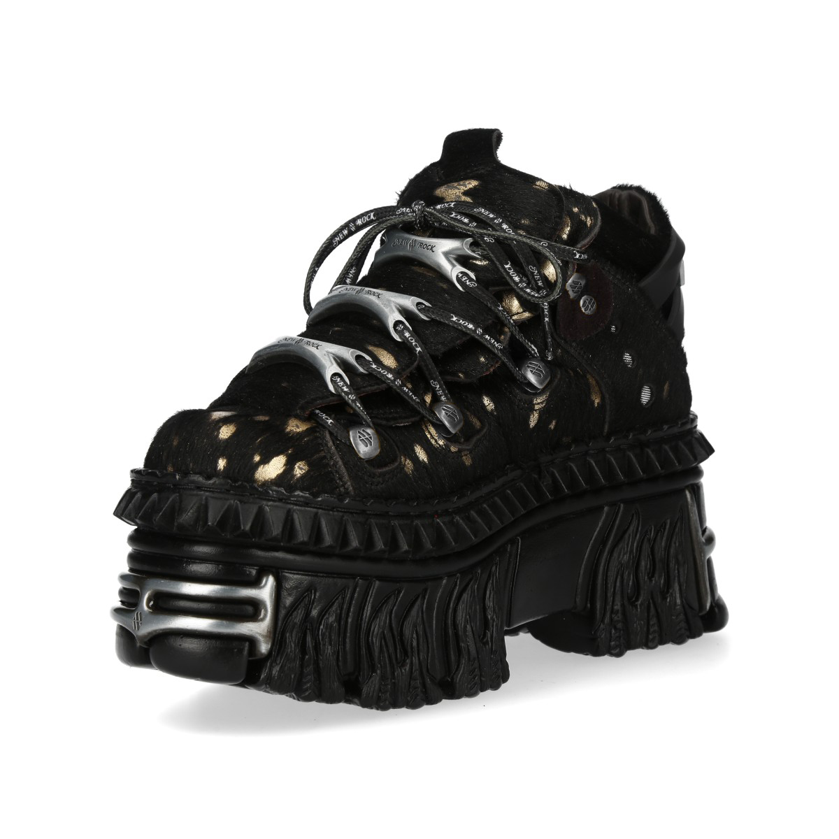 Эффектные кроссовки New Rock чёрного цвета из натуральной кожи для взрослых, модельные, унисекс, демисезонные. Шнурки чёрного цвета, крепятся на серебряных крючках с металлическими косточками. Массивная подошва чёрного цвета New Rock Flame из полиуретана.