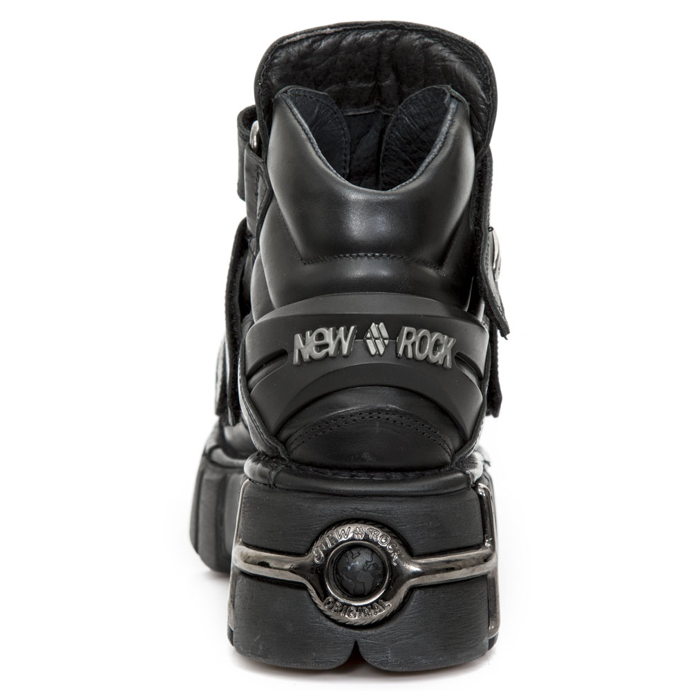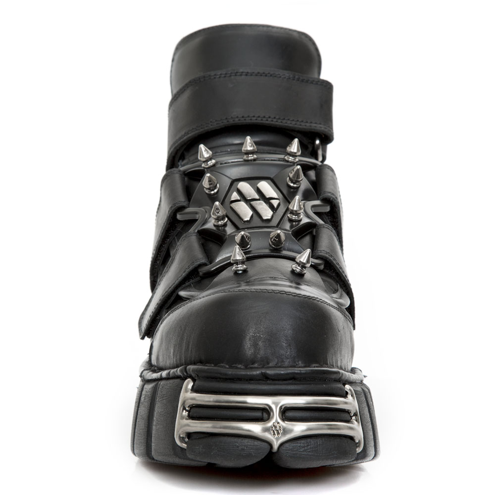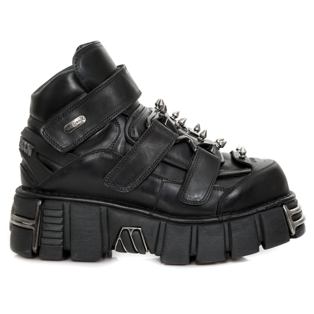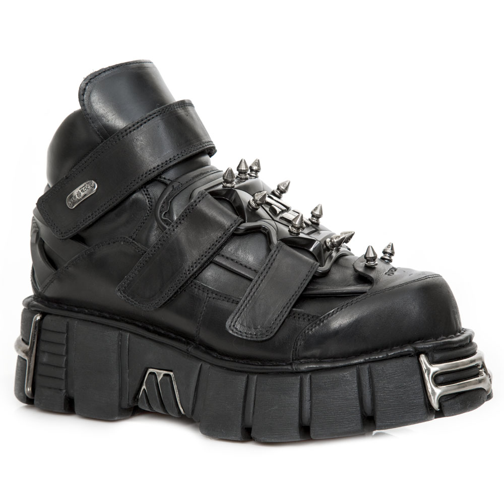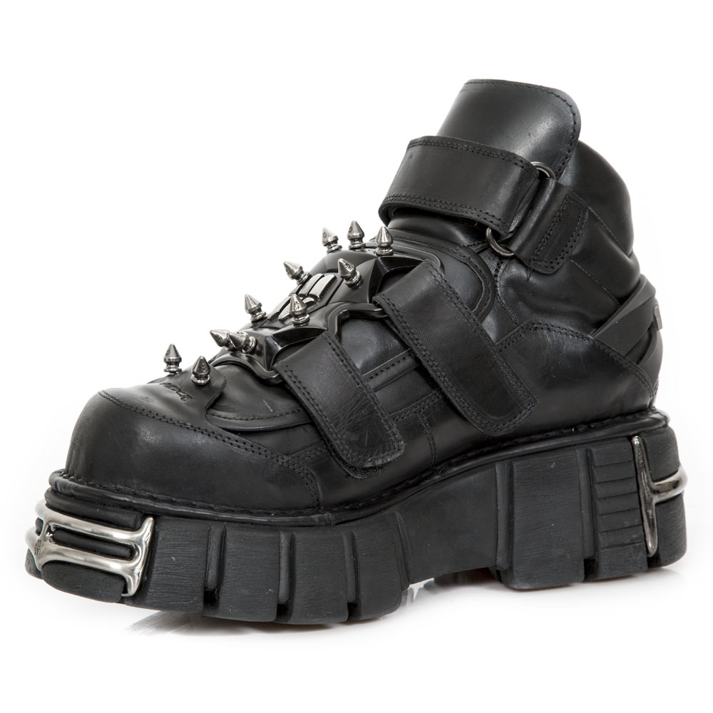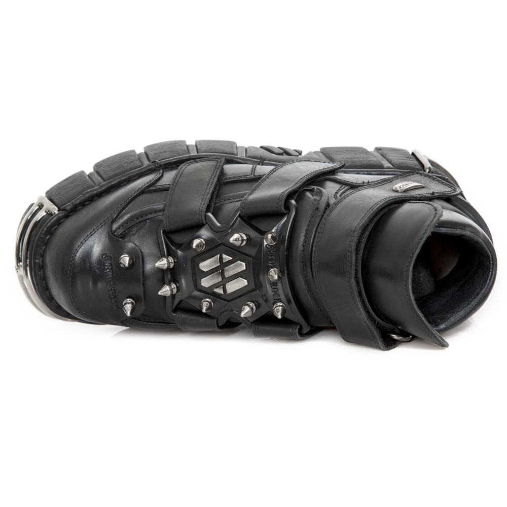Эффектные кроссовки New Rock на липучках чёрного цвета из натуральной кожи. С шипами. Подошва New Rock Classic из полиуретана чёрного цвета. На подошве имеются декоративные металлические накладки. Сзади ботинка на пятке находится пластиковое декоративное украшение с названием бренда.