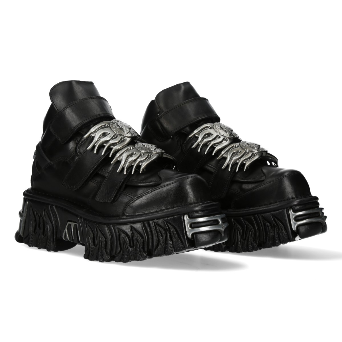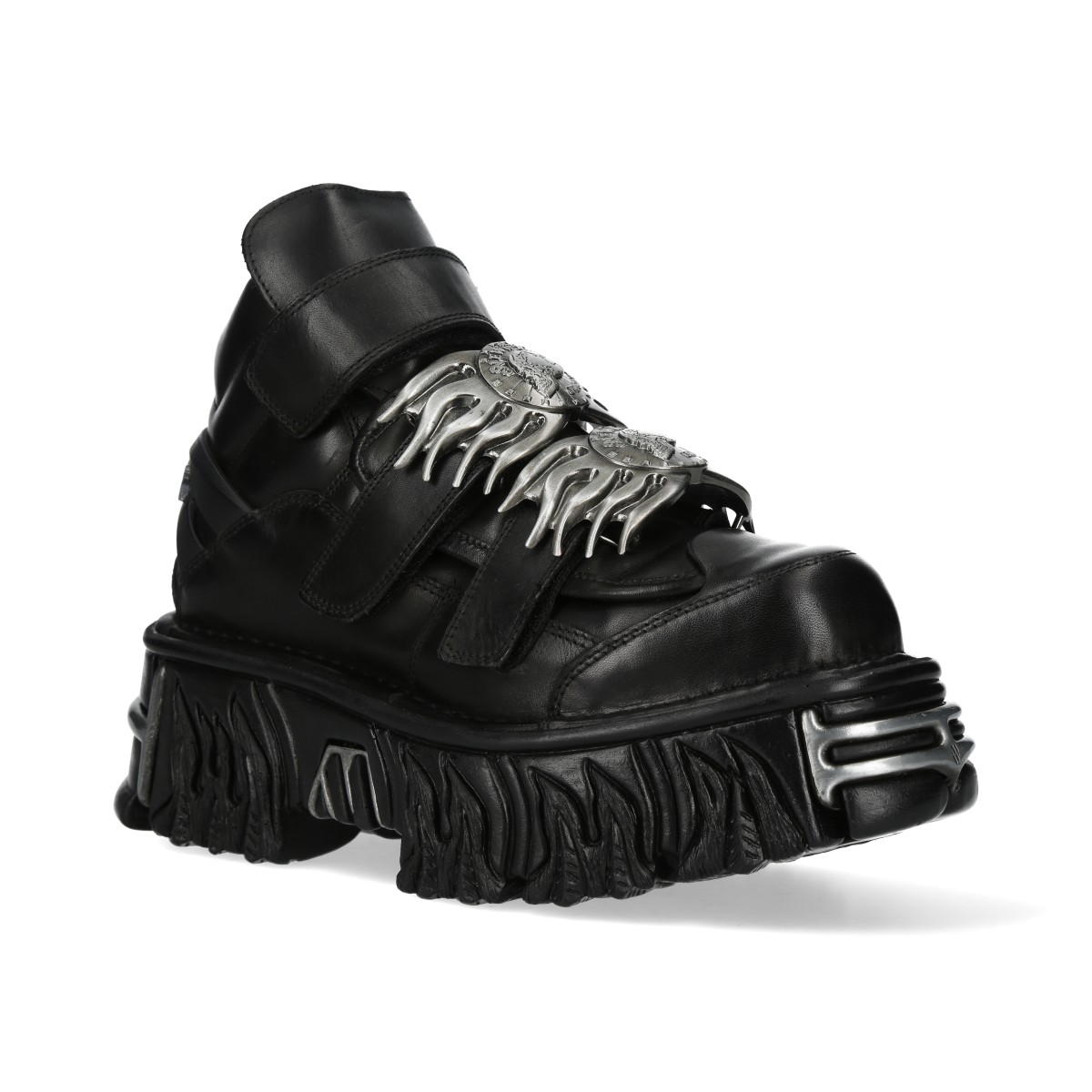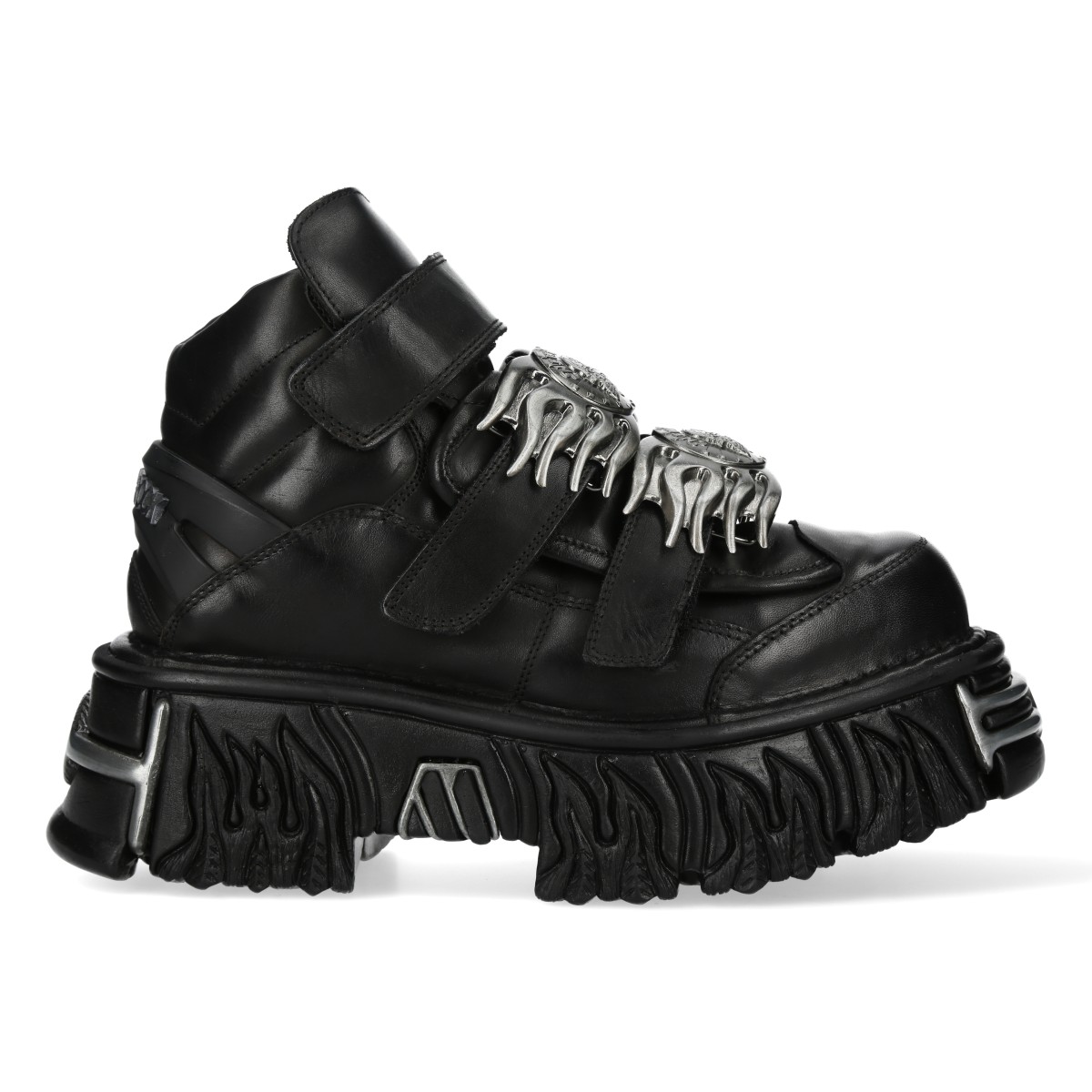 Эффектные кроссовки от бренда New Rock из натуральной кожи с дизайнерскими элементами сзади ботинка. На липучках металлические пряжки. Массивная подошва New Rock Flame с металлическими деталями.