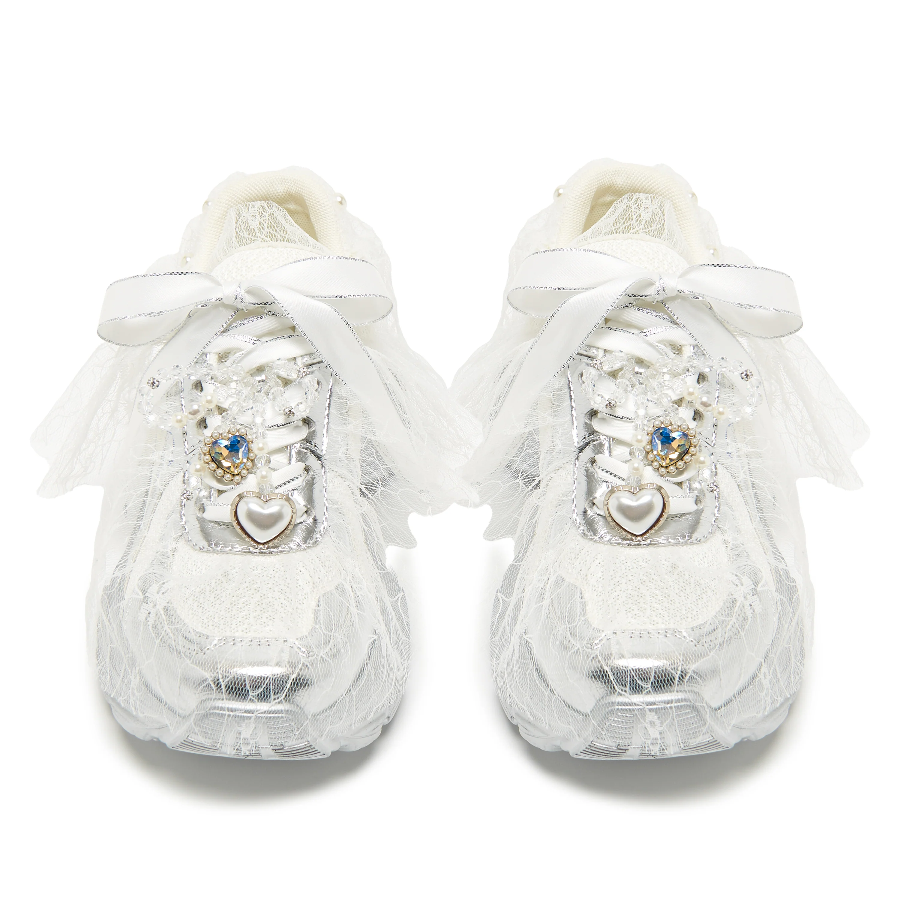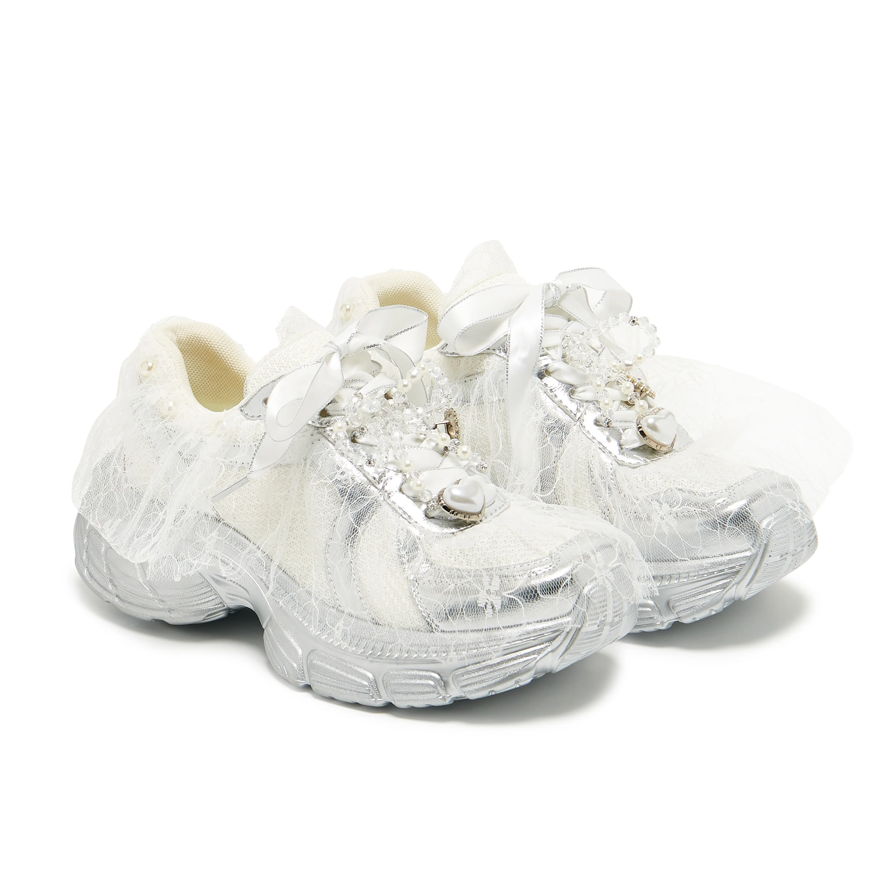 Пронизанные фантазией, но с прочной основой. Кроссовки Kelpie — это сочетание сказки и уличной моды. Обернутые нежным кружевом, отделанные жемчугом и серебряной лентой, и украшенные небесными подвесками, они одновременно напоминают винтажную невесту и космического ангела эпохи 2000-х.